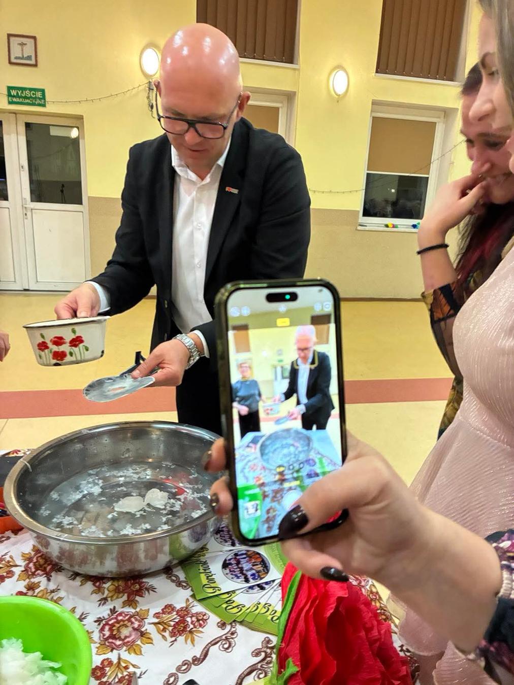 Między tańcami animatorka Gosia przypomniała zebranym dawne andrzejkowe wróżby – niejeden gość zdziwił się, co pokazał wosk! A że potupajka bez jedzenia to nie potupajka – KGW z Bystrzycy zadbało o stoły pełne smaków: wędliny, sery, smalec, słodkości… palce lizać! A bigos pana Pawła? Legendarny – sądząc po ilości doniesionych talerzy!