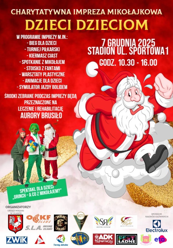 Impreza odbędzie się w Oławskim Centrum Kultury Fizycznej przy ul. Sportowej - 7 grudnia, start o 10.30. W programie wiele atrakcji, m.in. bieg dla dzieci, turniej piłkarski, kiermasz ciast czy spotkanie z Mikołajem. Spektakl dla dzieci jest jedną z niespodzianek.