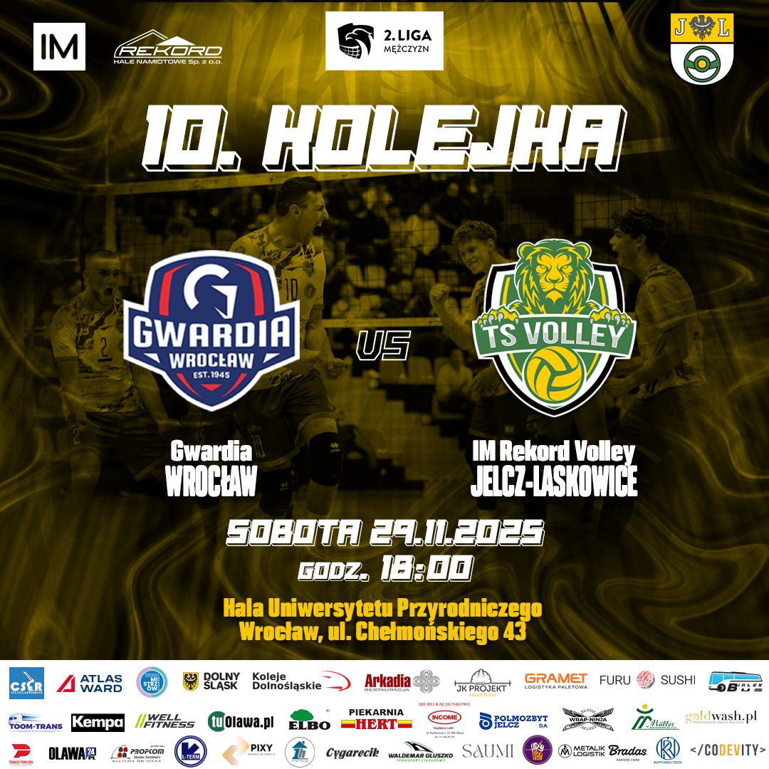 W klubowej zapowiedzi czytamy: - Siatkarze Jelczańskich Lwów nie zwalniają tempa. W środę stoczyli zwycięski bój w Pucharze Polski z CUK Anioły Toruń (3:1), a już w sobotę o godzinie 18.00 w Hali Uniwersytetu Przyrodniczego we Wrocławiu rozegrają niezwykle ważny mecz dla układu tabeli II Ligi. W derbach Dolnego Śląska zmierzymy się na wyjeździe z Gwardią Wrocław. Temperatury spotkaniu dodaje fakt, że siatkarze IM Rekord Volley zajmują pierwsze miejsce w tabeli, a zespół Gwardii znajduje się na drugim miejscu ze stratą tylko dwóch punktów. Oba zespoły świetnie spisują się w trwającym sezonie i legitymują się bilansem 7 zwycięstw i 1 porażki. Szykuje się kolejne niesamowity mecz naszych siatkarzy. Liczymy, że wybierzecie się do Wrocławia i będziecie kibicować Jelczańskim Lwom w hali przy ul. Chełmońskiego.