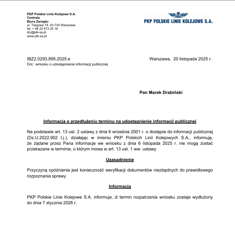 - Pod koniec września pytałem w poście, czy Polregio da radę? - pisał wczoraj w mediach społecznościowych. - Dzisiejszy dzień to była kropka nad "i". Cegiełkę dołożyły też niestety Polskie Linie Kolejowe S.A. Rano pociąg 46219 został zatrzymany w Brzegu, w celu przepuszczenia opóźnionego o ponad 260 minut IC "Przemyślanin"! Efekt, kilkadziesiąt osób, w tym ja, spóźniło się do pracy. Popołudniowy powrót z Wrocławia to ciąg dalszy opóźnień. Pociąg 64230, który miał odjazd 15.28, odjechał o 15.45. Kumulacja podróżnych z dwóch pociągów (następny ten z 15.44 też odjechał później), sprawiła, że na peronie pachniało latami 80. Niestety, tak jest niemal codziennie. Gdzieś musi być przyczyna. Jak coś nie działa tak jak trzeba, to trzeba to naprawić. Kilka tygodni temu zwróciłem się więc z prośbą do PKP PLK S.A. o udzielenie informacji, co jest przyczyną tych opóźnień. Po dwóch tygodniach otrzymałem odpowiedź, że sprawa jest skomplikowana i muszę poczekać do 7 stycznia 2026r. Pozostaje więc nam cierpliwie poczekać na odpowiedź.