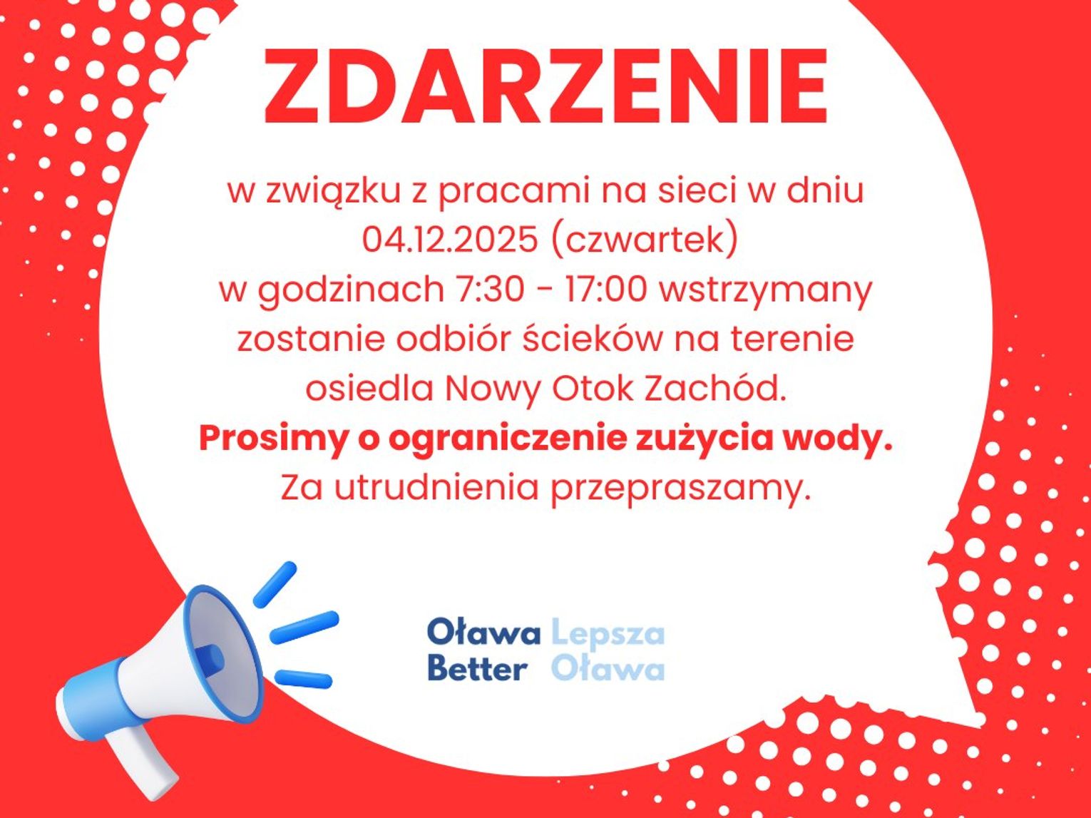 W związku z pracami na sieci w dniu 4 grudnia 2025 r. (czwartek) w godz. 7:30 - 17:00 wstrzymany zostanie odbiór ścieków na terenie osiedla Nowy Otok Zachód (część osiedla zlokalizowana od drogi wojewódzkiej do Osiedla Reńskiego).