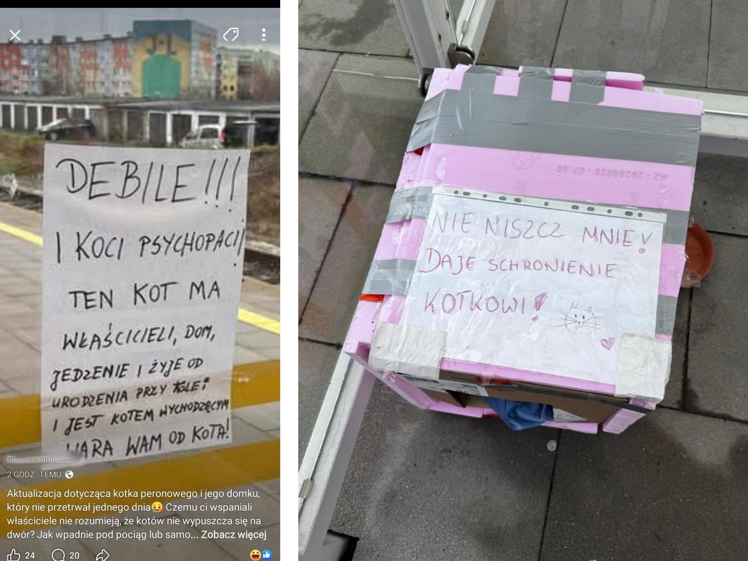 I taki komentarz od Oliwii: - Aktualizacja dotycząca kotka peronowego i jego domku, który nie przetrwał jednego dnia. Czemu ci wspaniali właściciele nie rozumieją, że kotów nie wypuszcza się na dwór? Jak wpadnie pod pociąg lub samochód to dopiero zrozumieją? Mam nadzieję, że ktoś odpowiedzialny będzie w stanie go przygarnąć i dać mu ciepły dom...