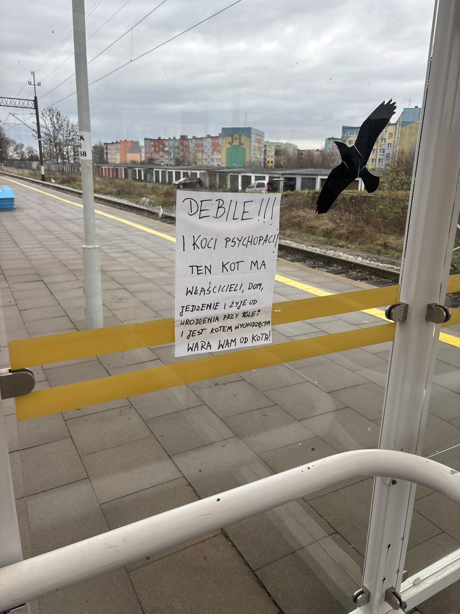 Od wiosny w mediach społecznościowych pojawiają się posty o kocie bytującym na peronie PKP w Jelczu-Laskowicach. Ludzie go dokarmiają. Stał się słynny, gdy latem wsiadł do pociągu i został wypuszczony w Miłoszycach (przez chwilę było więc jak w tej znanej historii "O kocie, co jeździł koleją"). Potem przez miesiąc kilka osób robiło ogłoszenia i szukało go, ale ponoć wśród nich nie było właścicielki. Po miesiącu znaleziono go, ktoś chciał mu dać dom, ale przecież kot ma właściciela. Teraz, gdy zrobiło zimniej, pewna dziewczyna zrobiła mu budkę, postawiła na peronie, ale ta szybko została zabrana i dzisiaj w miejsce domku pojawiło, się takie ogłoszenie.