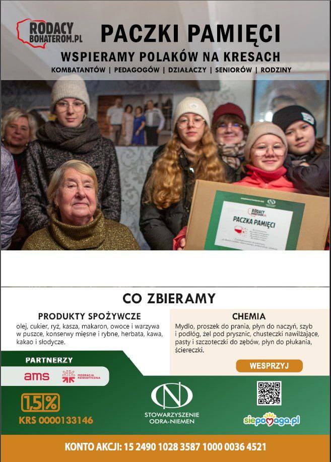 W mediach społecznościowych Stowarzyszenia Patriotycznego "Jednostka Sokołów" z Jelcza-Laskowic czytamy: - Jest to akcja Stowarzyszenie Odra - Niemen, która polega na zbiórce produktów żywnościowych (z długim terminem ważności) oraz środków chemicznych dla Polaków z dawnych Kresów Wschodnich i naszych weteranów walk o niepodległość. Kolejny raz nasze Stowarzyszenie przyłącza się do tej szlachetnej inicjatywy. W tym roku do naszej akcji w powiecie oławskim oraz wrocławskim przyłączyła się sieć sklepów Dino Polska.