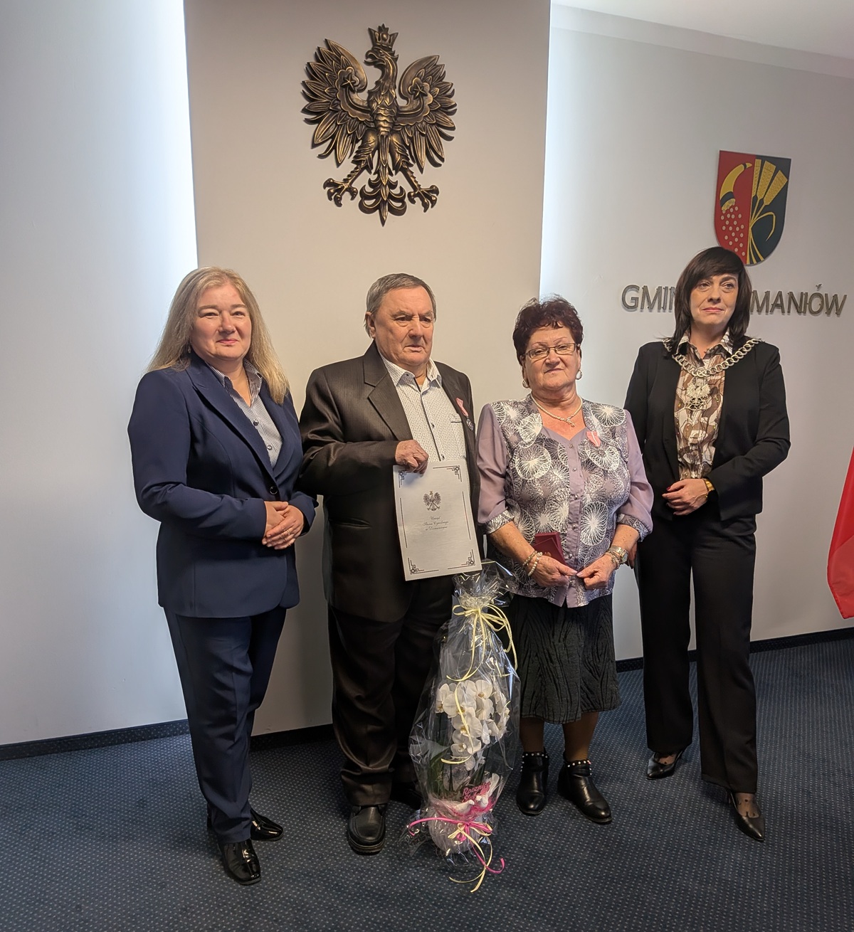 W otoczeniu najbliższej rodziny, Wójt Gminy Domaniów Pani Dorota Sala uroczyście wręczyła medale, składając gratulacje oraz serdeczne życzenia. Do gratulacji i życzeń dołączyła Kierownik USC Pani Joanna Pach życząc Dostojnym Jubilatom wielu wspólnych lat w zdrowiu i pomyślności, spokoju i ludzkiej życzliwości, a także wiele kolejnych pięknych jubileuszy.