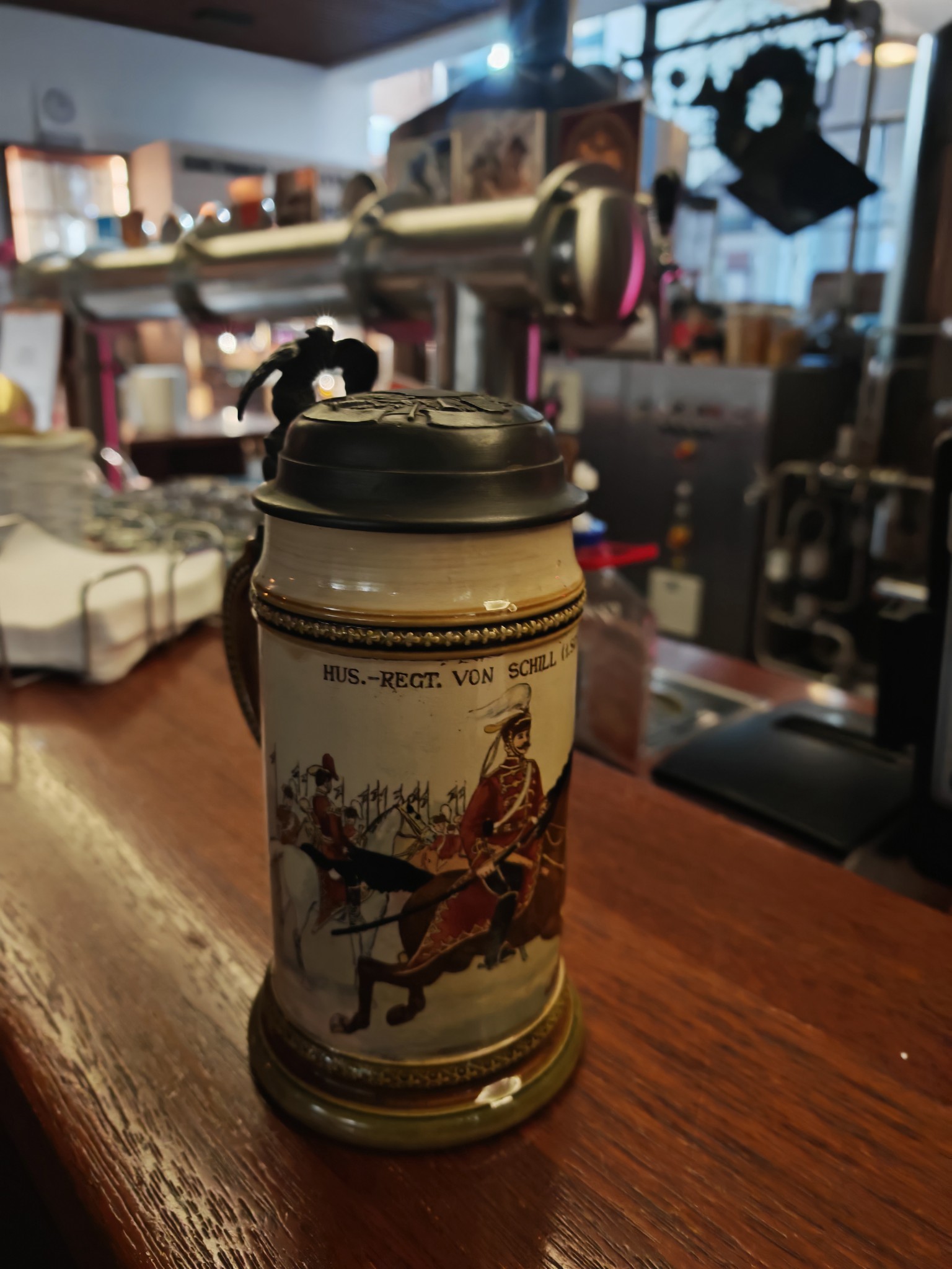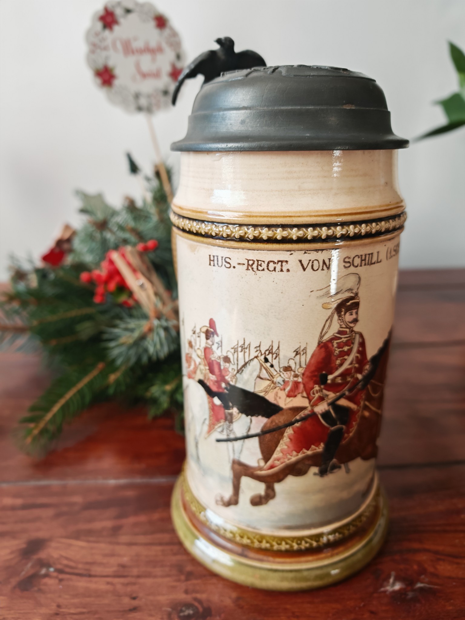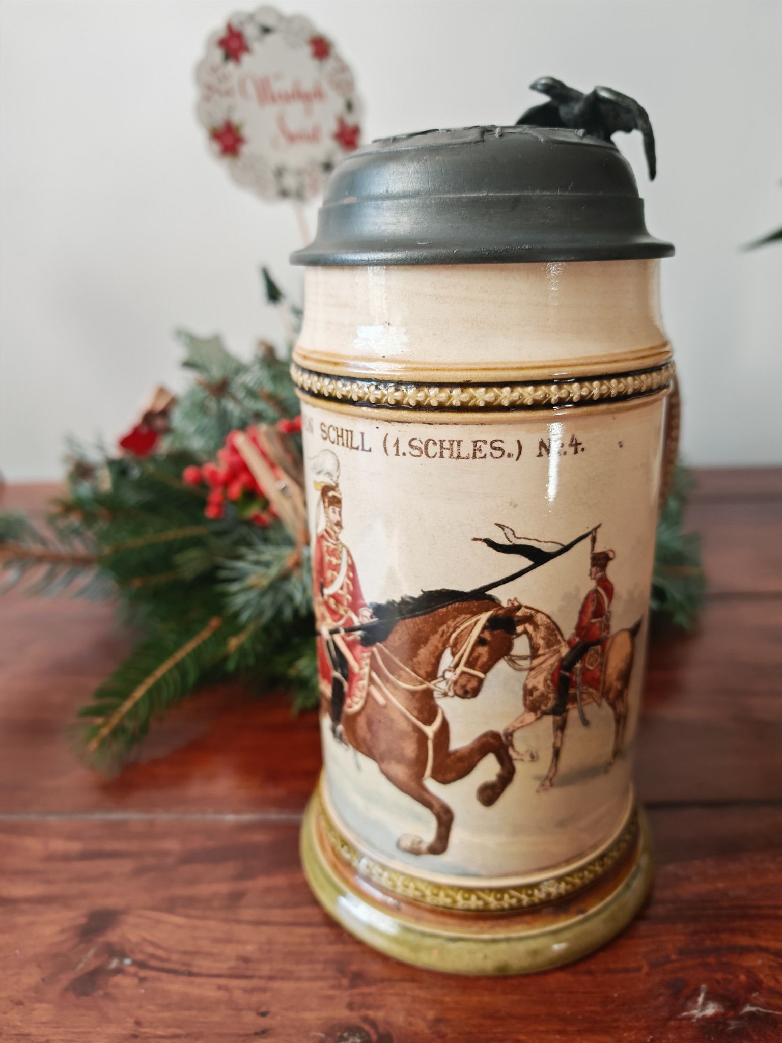 Jak wiecie, pozyskałem kiedyś szablę, tablo, bardzo ciekawe dokumenty z kancelarii nieistniejącego już 4 regimentu Schilla Oławskich Husarów. Nie będę się dziś tu rozpisywać na ich temat, ale za to chciałbym pokazać Państwu mój "Święty Graal" - mega rzadka rzeczy, autentyczny niemiecki kufel rezerwisty (niem. Reservistenkrug). Kufel pułkowy (niem. Reservistenkrug lub Regimentskrug) z wizerunkami huzarów z Regimentu von Schill (1. Śląski) Nr 4.