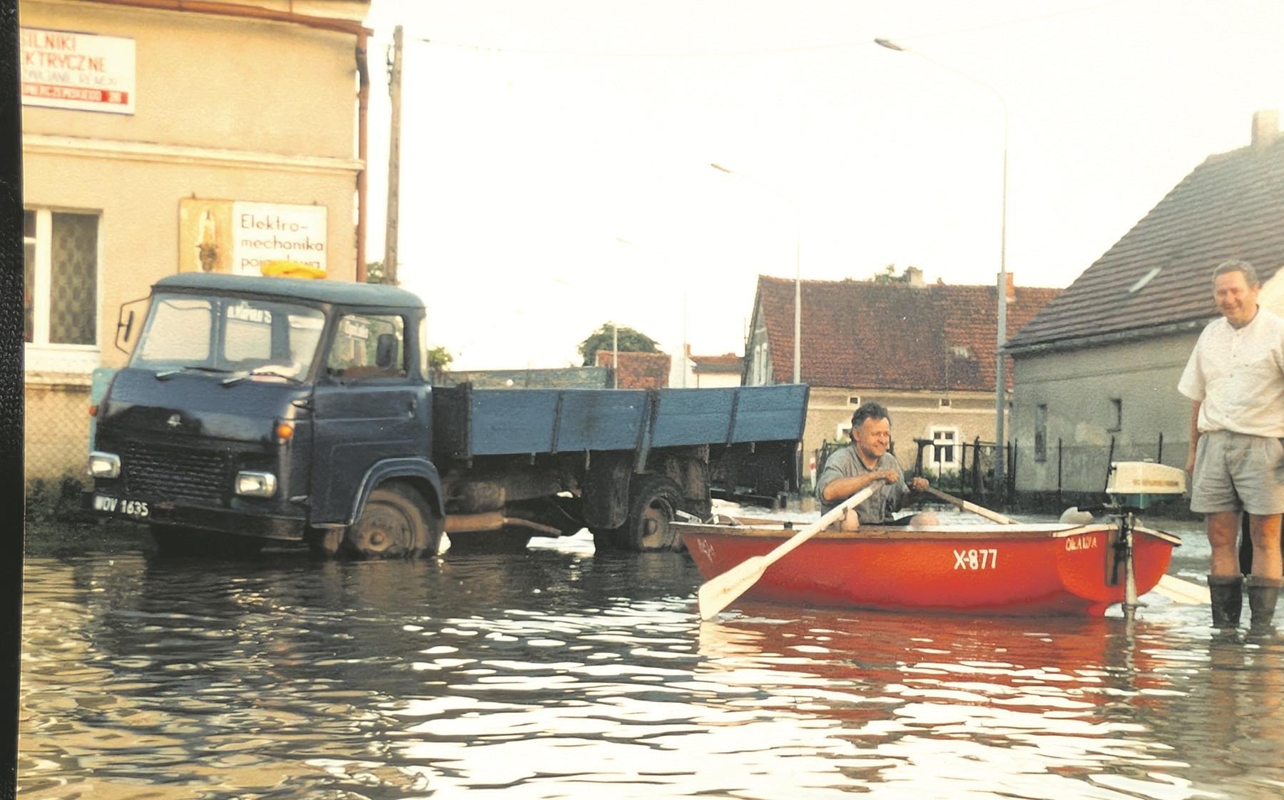 - Moja pierwsza łódeczka sprawdziła się także podczas powodzi w 1997 roku - mówi Andrzej Pawłowski, stojący po prawej. - Tu na zdjęciu akurat w Siechnicach. Przewoziliśmy powodzian do domów... na silniku wtedy pływaliśmy