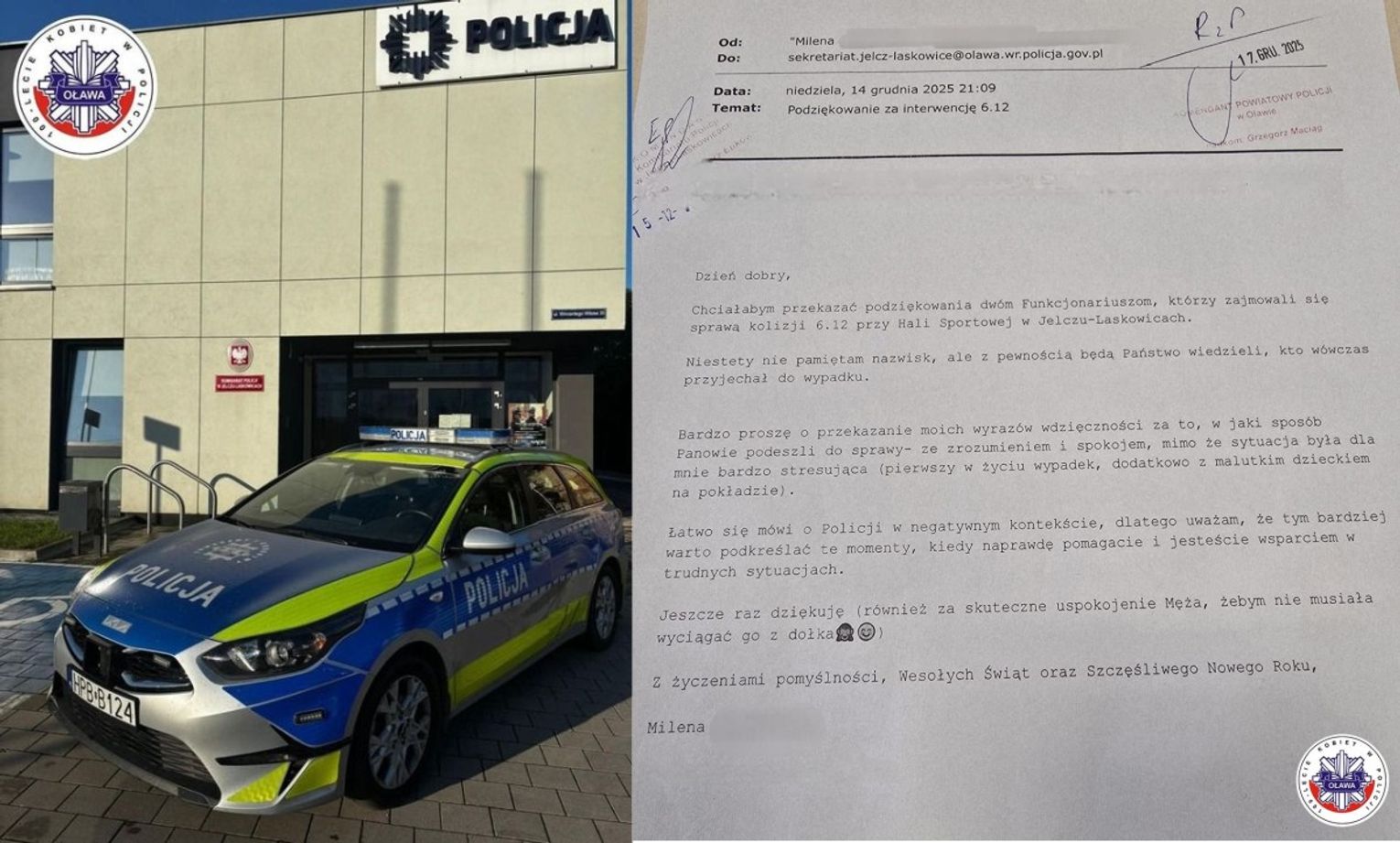 Autorka wiadomości wyraziła ogromną wdzięczność wobec dwóch policjantów z Komisariatu Policji w Jelczu-Laskowicach – post. Dawida Gałki oraz post. Pawła Michalskiego, którzy obsługiwali zdarzenie. Choć początkowo nie znała ich nazwisk, zapamiętała spokój, profesjonalizm i autentyczne zrozumienie okazane w jednej z najbardziej stresujących chwil jej życia.