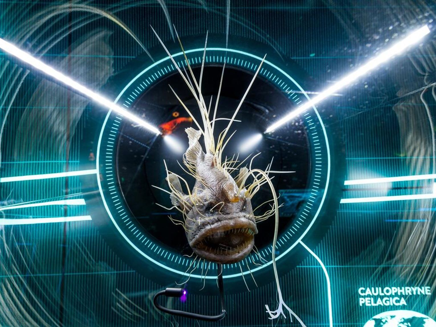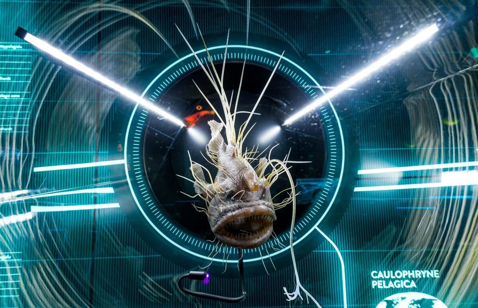 Jednym z bohaterów wystawy jest Caulophryne pelagica, znana również jako „ryba-wędkarz”, występuje we wszystkich oceanach na głębokości do 2500 metrów. Jest to niezwykle rzadki gatunek – na całym świecie odkryto jedynie 17 jego okazów. To niezwykłe stworzenie wykorzystuje do polowania charakterystyczną, świecącą narośl na głowie, która działa jak przynęta, zwabiając ofiary prosto do olbrzymiej paszczy. To także doskonały przykład zjawiska bioluminescencji, jednej z najciekawszych adaptacji głębinowych organizmów.