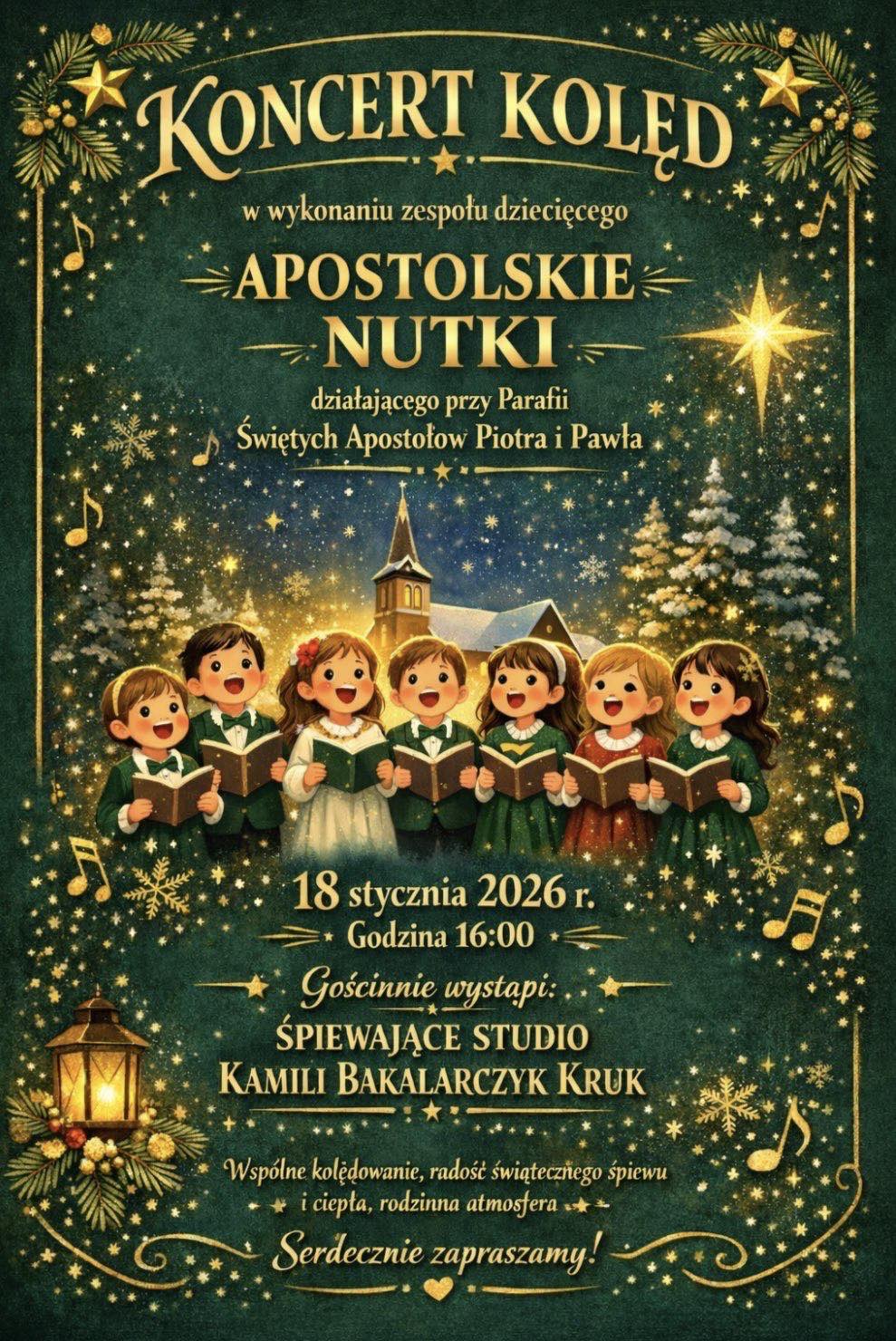 Koncert odbędzie się w najbliższą niedzielę, 18 stycznia o godz. 16:00 w kościele pw. śś. Ap. Piotra i Pawła w Oławie. Wystąpi parafialna schola dziecięca "Apostolskie Nutki" z udziałem Śpiewającego Studia Kamili Bakalarczyk-Kruk. Po koncercie będzie możliwość złożenia dobrowolnej ofiary do puszki. Zebrane środki zostaną w całości przeznaczone na działalność zespołu Apostolskie Nutki oraz na potrzeby dzieci, które co niedzielę posługują w tym kościele.