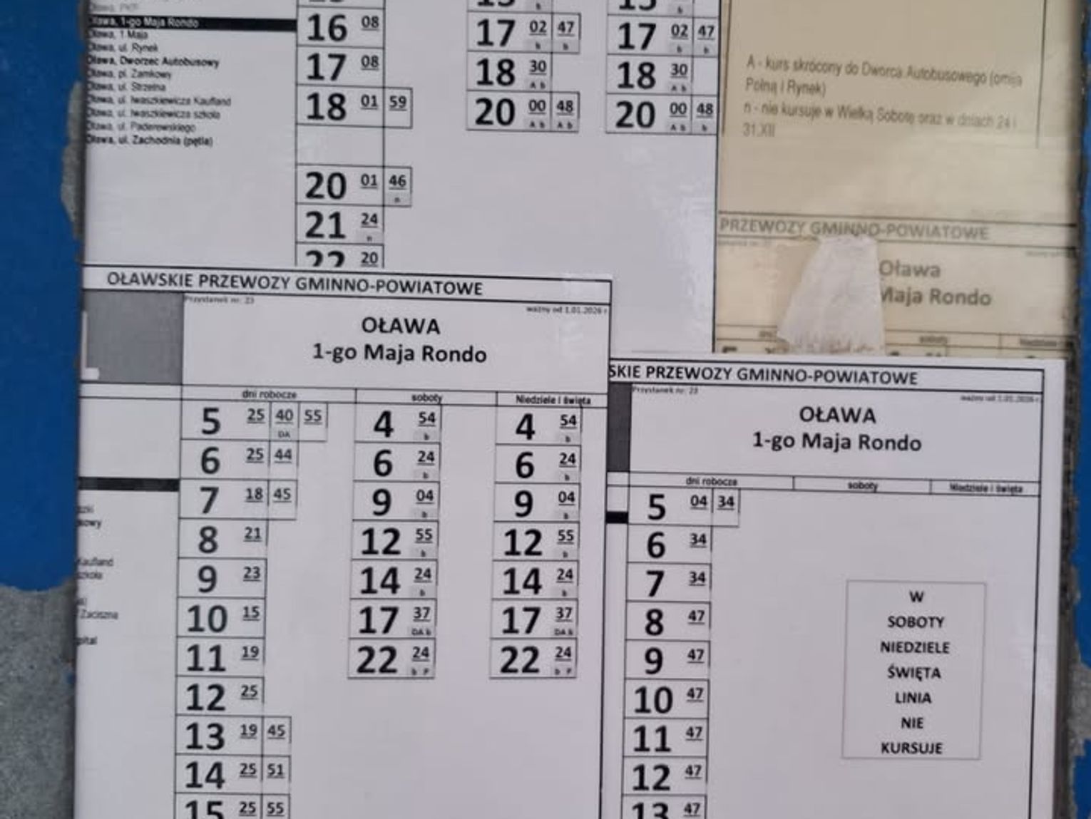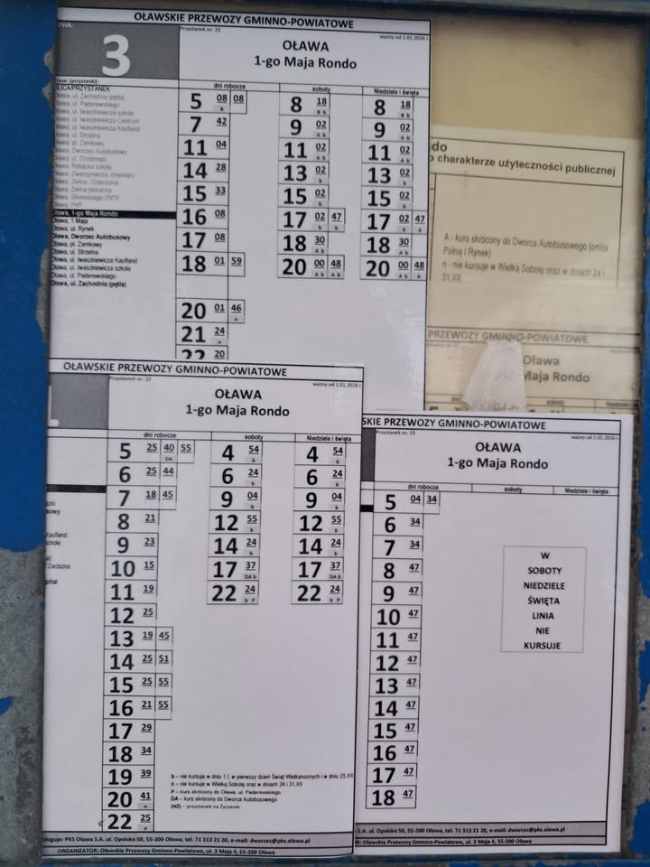 Jak widać na zdjęciu, ktoś próbował wcisnąć rozkłady Oławskich Przewozów Gminno-Powiatowych do starej ramki, zbyt małej jak na aktualne potrzeby, w efekcie jeden rozkład jest naklejony na inny, niektóre nazwy ulic są zasłonięte, generalnie trudno się zorientować i normalnie skorzystać.