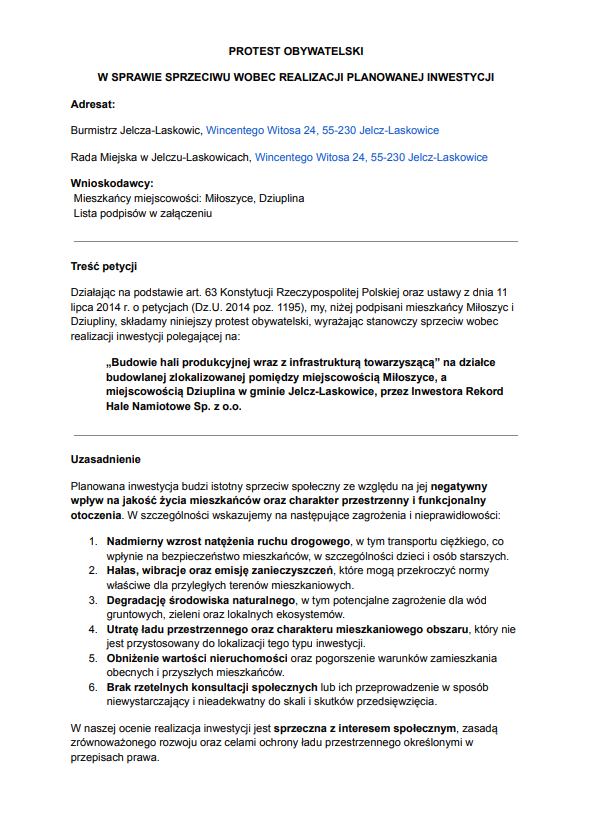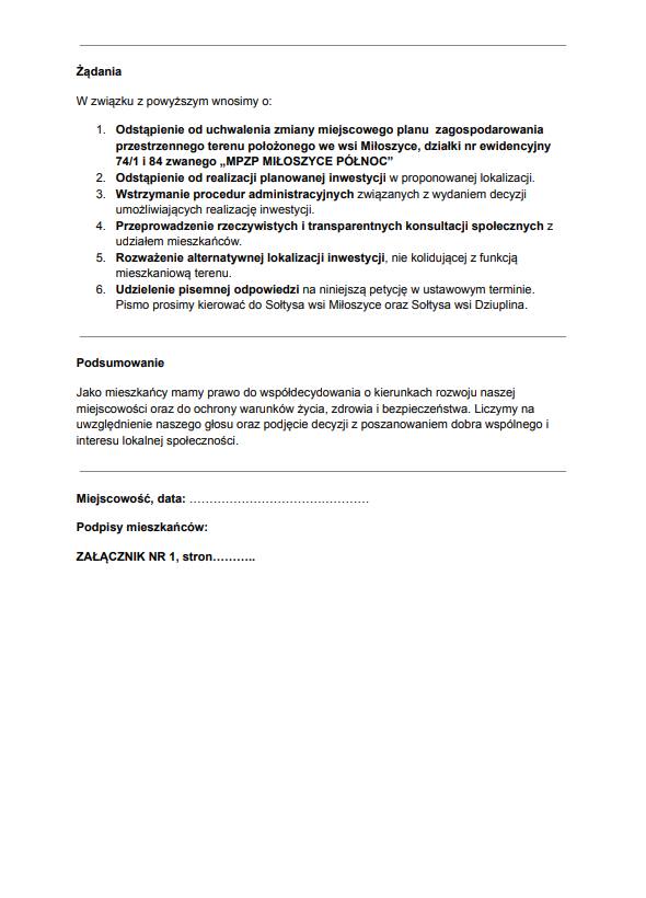 Dziś na profilu facebookowym "Miłoszyce. mała wieś - wielkie możliwości" pojawił się apel: Szanowni mieszkańcy, jeśli ktoś ma ochotę i możliwość wesprzeć PROTEST OBYWATELSKI W SPRAWIE SPRZECIWU WOBEC REALIZACJI PLANOWANEJ INWESTYCJI, a nie był obecny w domu podczas zbiórki podpisów przez zaangażowanych mieszkańców, jest dalej możliwość podpisania protestu.