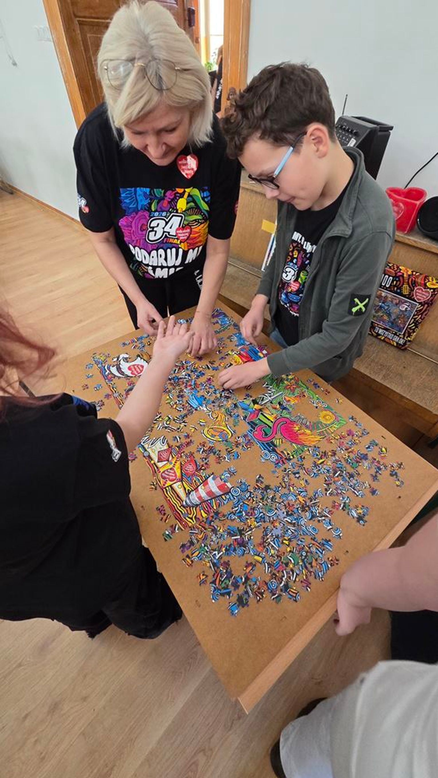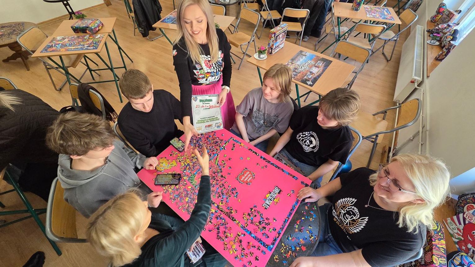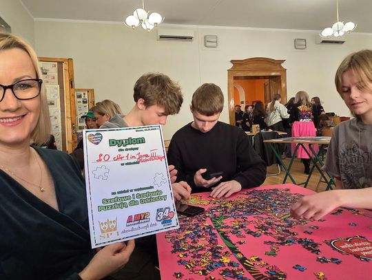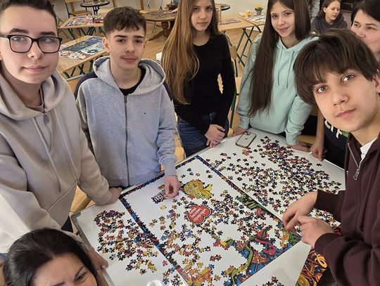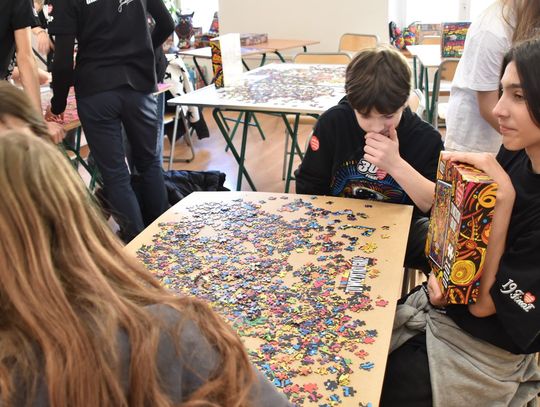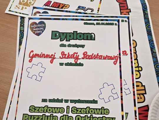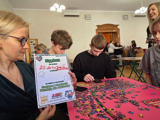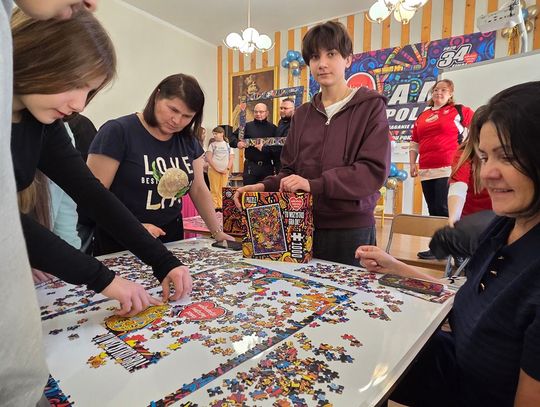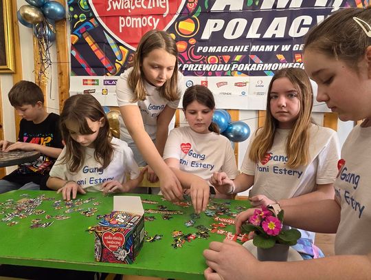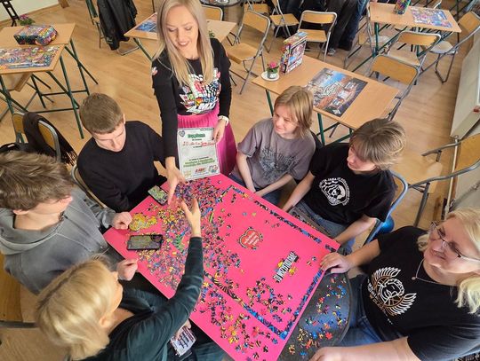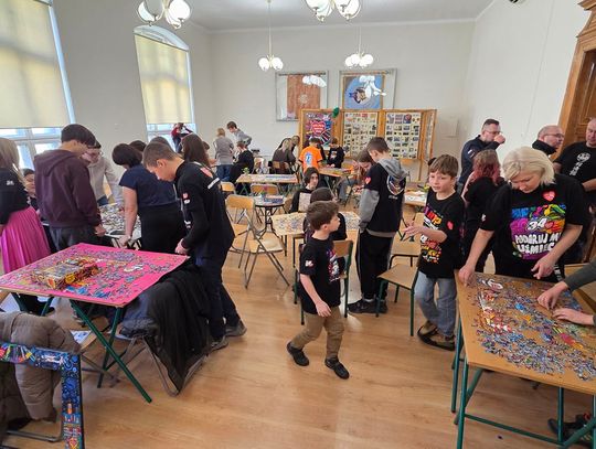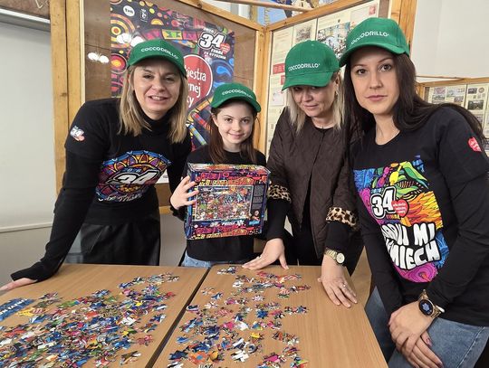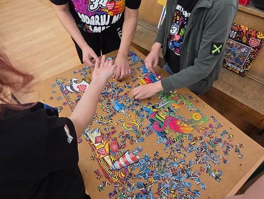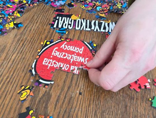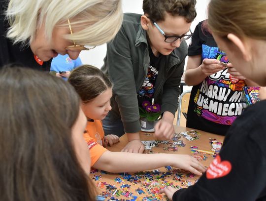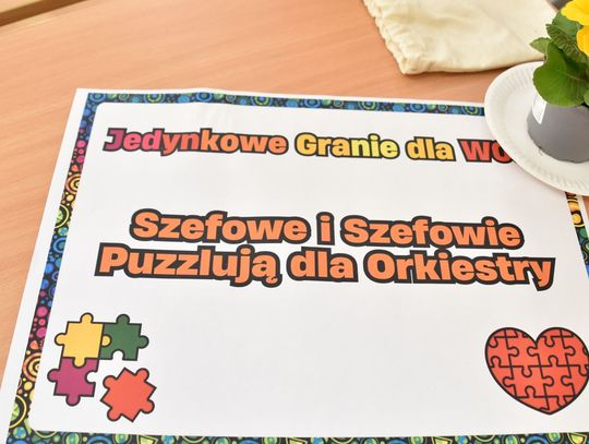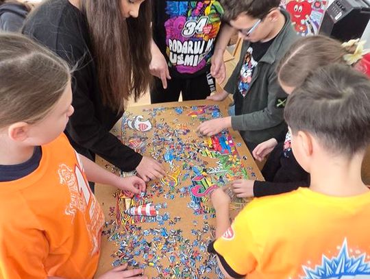 - W tamtym roku ktoś zażartował: „A będzie burmistrz?” - wspomina pani Justyna. - Przyznam, że nie pomyśleliśmy nawet o tym, że do układania puzzli można zaprosić dorosłych. Dlatego w tym roku, przygotowując tę inicjatywę na „jedynkowy” finał WOŚP, uznaliśmy: a dlaczego by nie burmistrz czy inne osoby dorosłe - szefowe i szefowie, przy okazji z pełnymi portfelami. I w taki sposób w tym roku nie tylko dzieci układają puzzle, ale też dorośli, a dzieci im w tym towarzyszą.