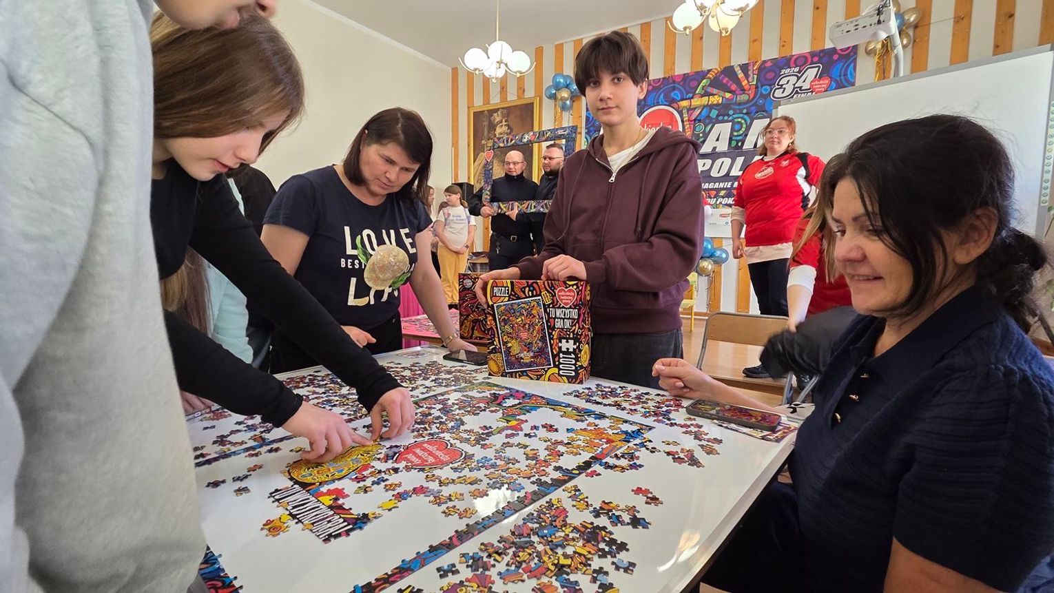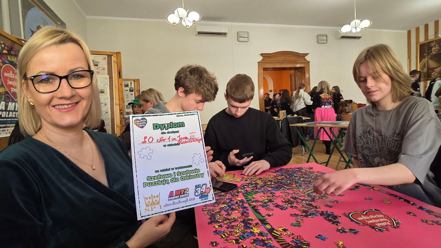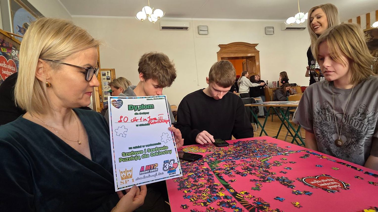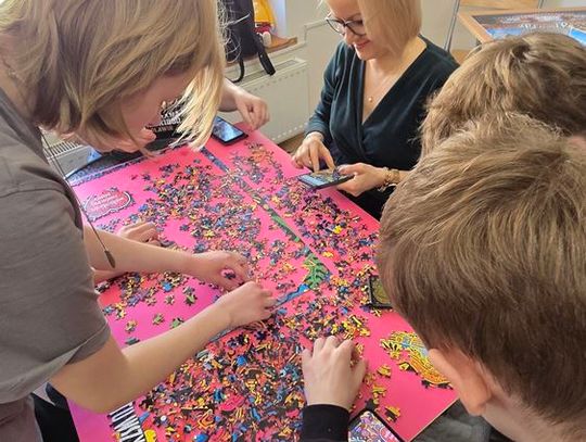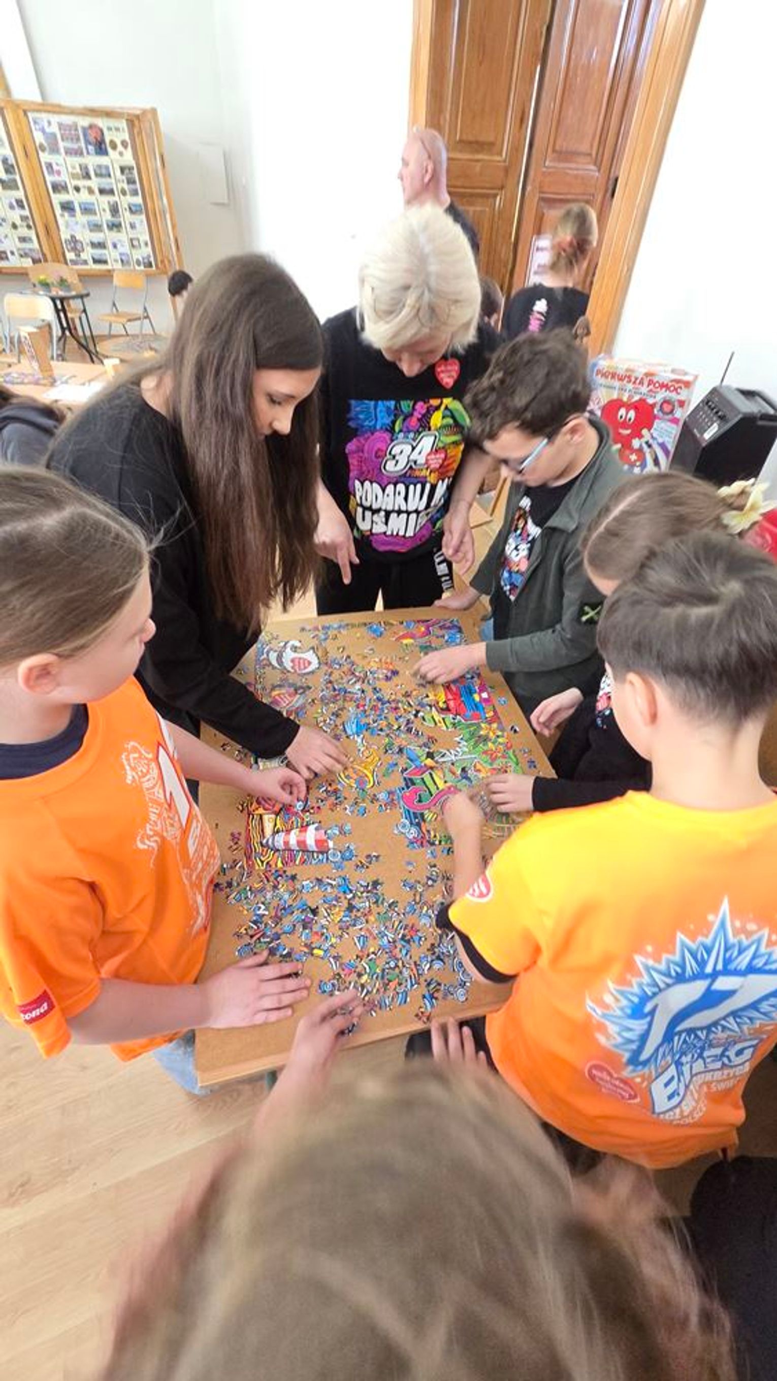 - W tamtym roku ktoś zażartował: „A będzie burmistrz?” - wspomina pani Justyna. - Przyznam, że nie pomyśleliśmy nawet o tym, że do układania puzzli można zaprosić dorosłych. Dlatego w tym roku, przygotowując tę inicjatywę na „jedynkowy” finał WOŚP, uznaliśmy: a dlaczego by nie burmistrz czy inne osoby dorosłe - szefowe i szefowie, przy okazji z pełnymi portfelami. I w taki sposób w tym roku nie tylko dzieci układają puzzle, ale też dorośli, a dzieci im w tym towarzyszą.