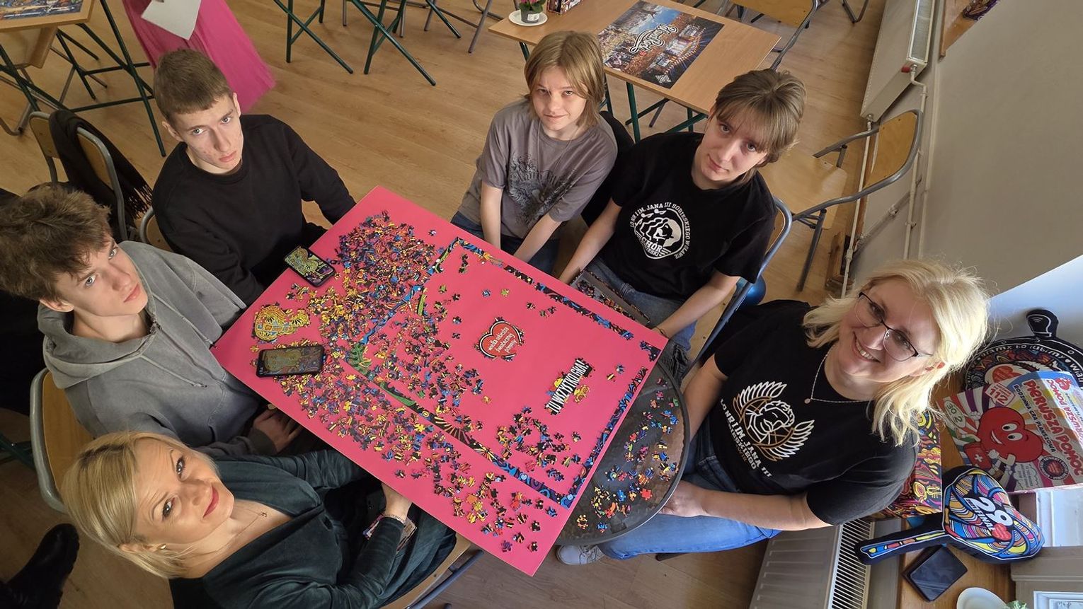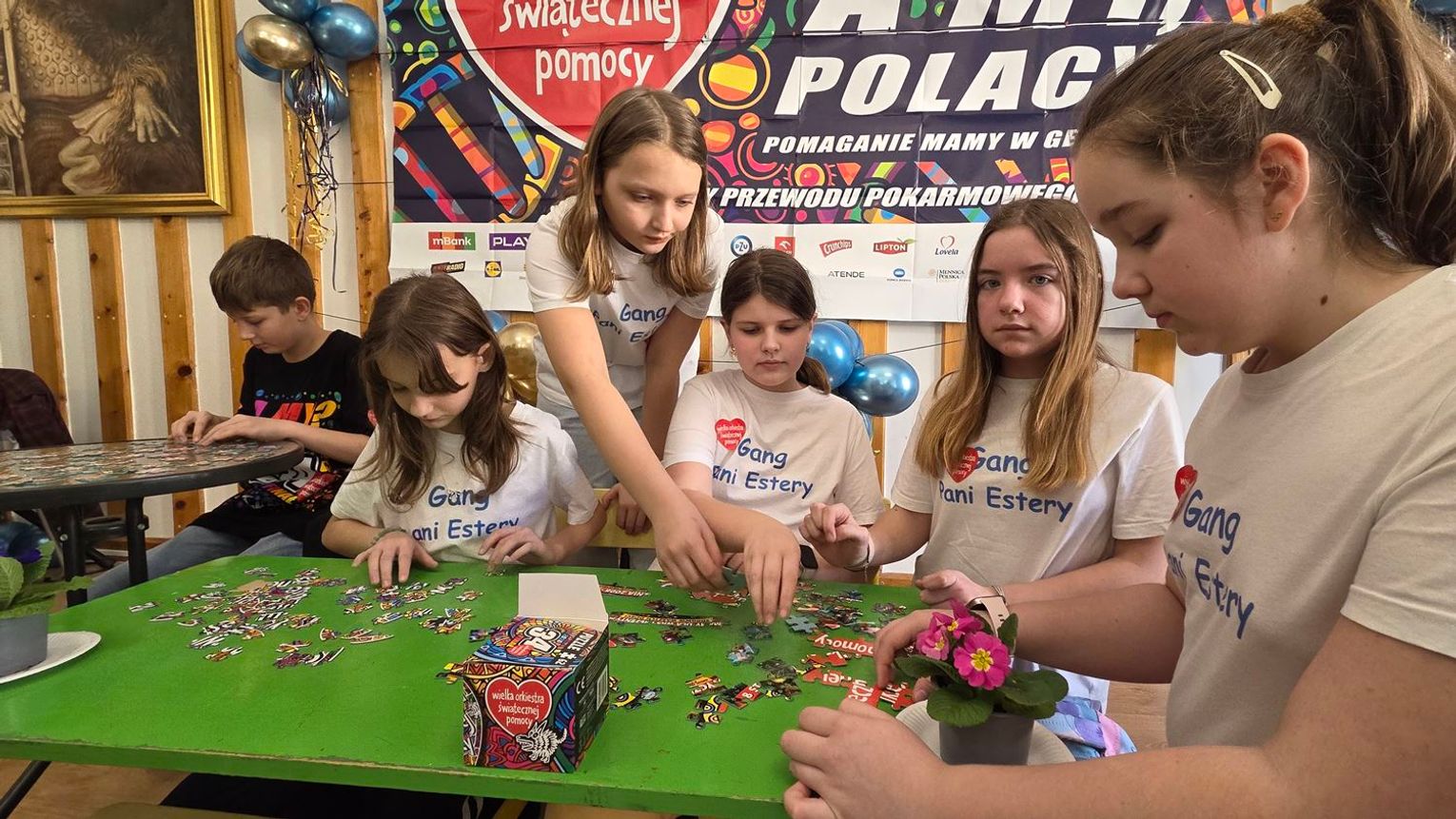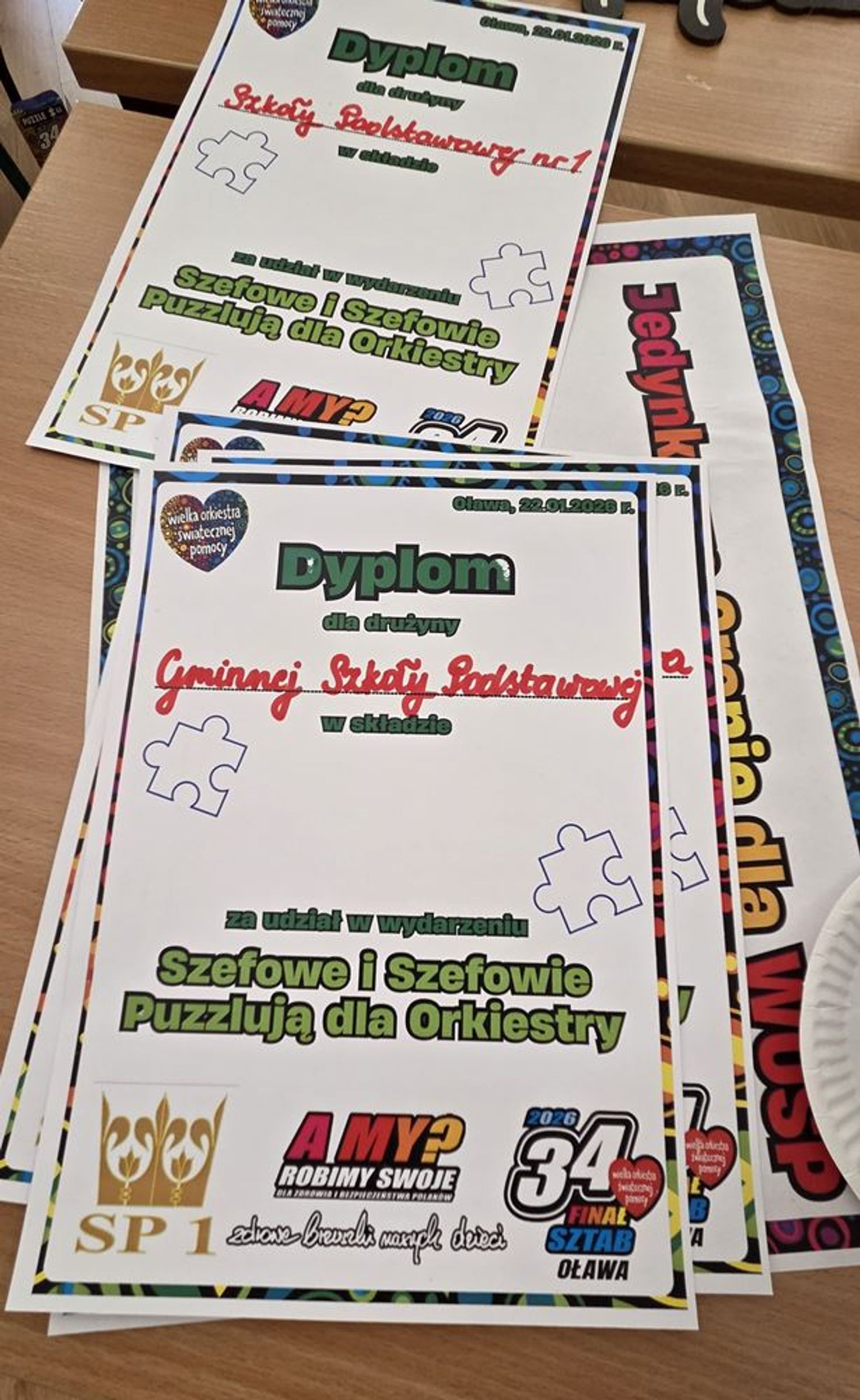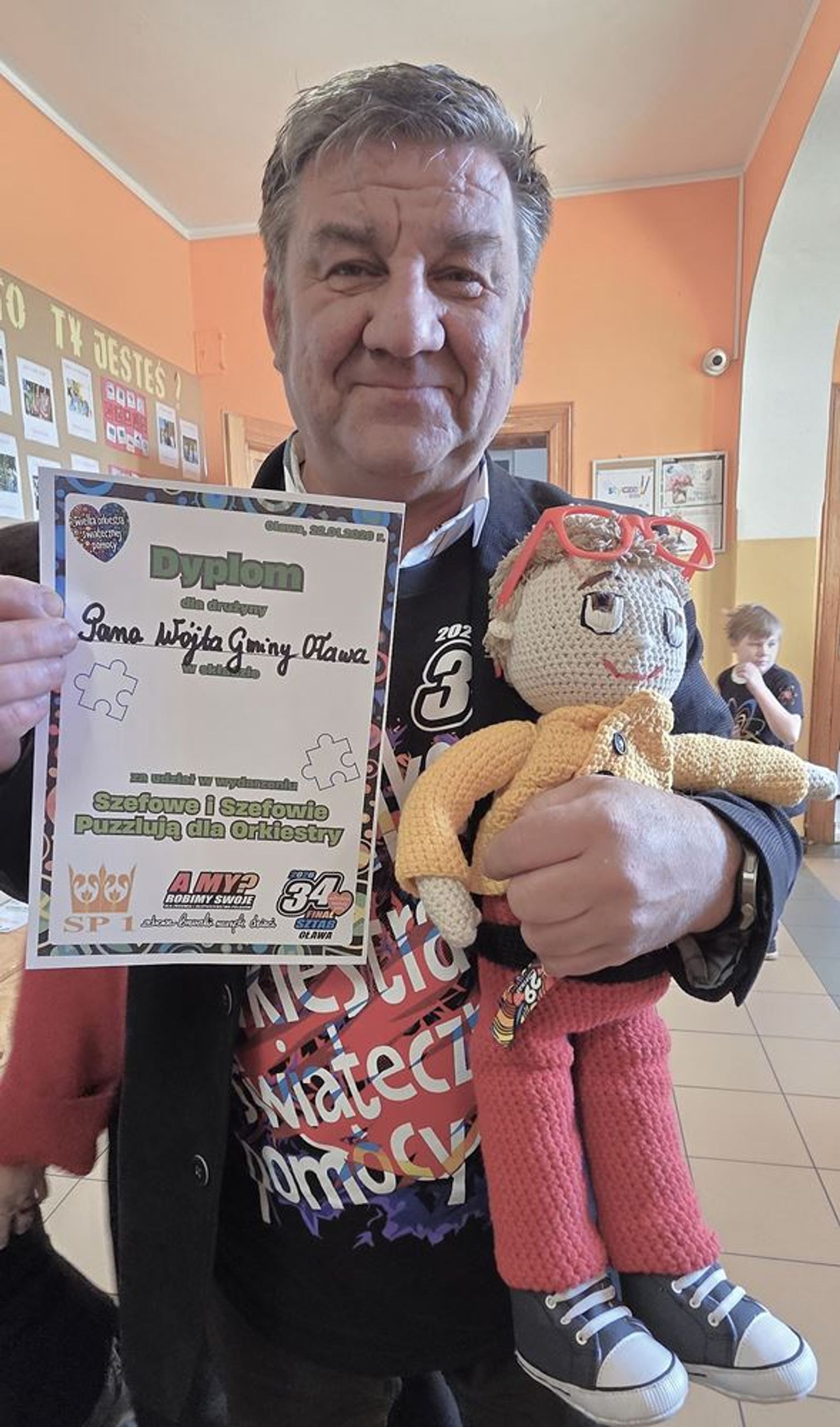 - W tamtym roku ktoś zażartował: „A będzie burmistrz?” - wspomina pani Justyna. - Przyznam, że nie pomyśleliśmy nawet o tym, że do układania puzzli można zaprosić dorosłych. Dlatego w tym roku, przygotowując tę inicjatywę na „jedynkowy” finał WOŚP, uznaliśmy: a dlaczego by nie burmistrz czy inne osoby dorosłe - szefowe i szefowie, przy okazji z pełnymi portfelami. I w taki sposób w tym roku nie tylko dzieci układają puzzle, ale też dorośli, a dzieci im w tym towarzyszą.
