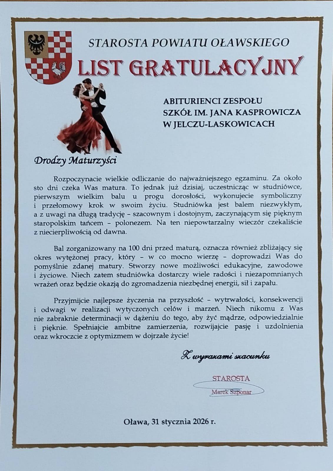 Podczas studniówki w Zespole Szkół im. Jana Kasprowicza w Jelczu-Laskowicach obecny był starosta Marek Szponar, który podzielił się osobistym wspomnieniem, podkreślając, że dokładnie 45 lat temu sam był absolwentem naszej szkoły. Ta sentymentalna refleksja stała się pięknym dowodem na to, jak silne więzi łączą kolejne pokolenia uczniów ze szkołą oraz jak trwałe wartości są w niej przekazywane.