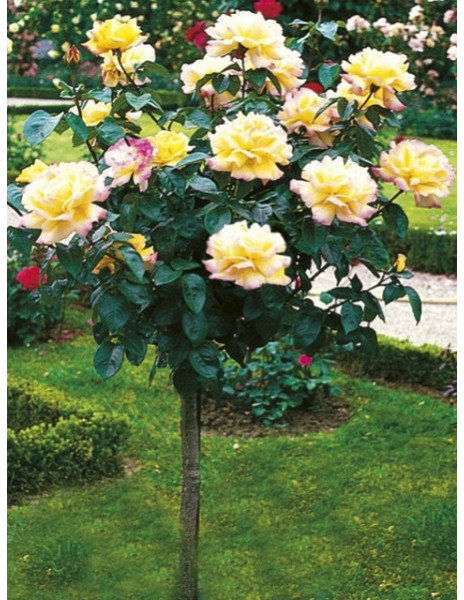 - róże pienne szczepione na bazie odmian wielkokwiatowych – łączą duży kwiat z reprezentacyjną formą.