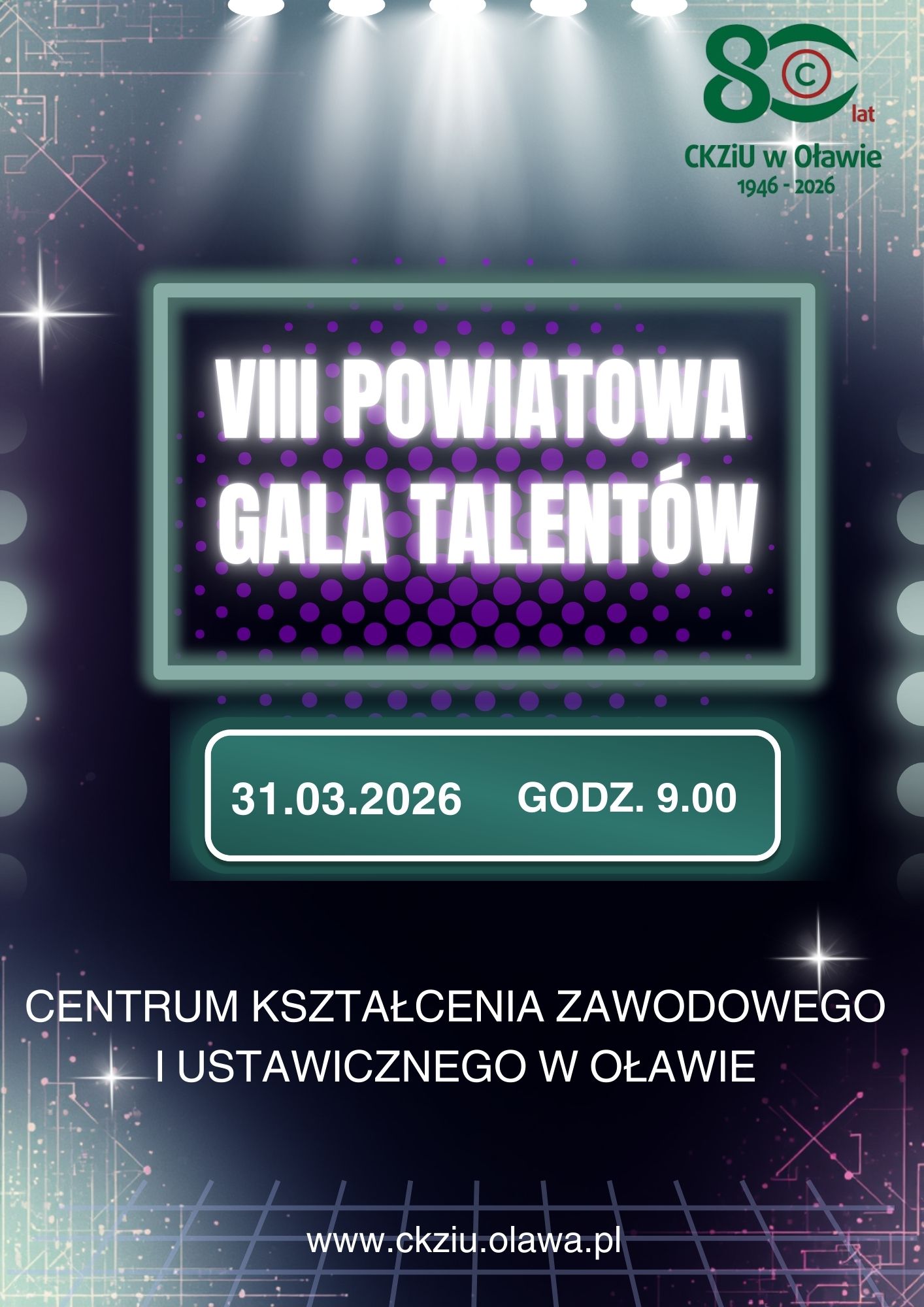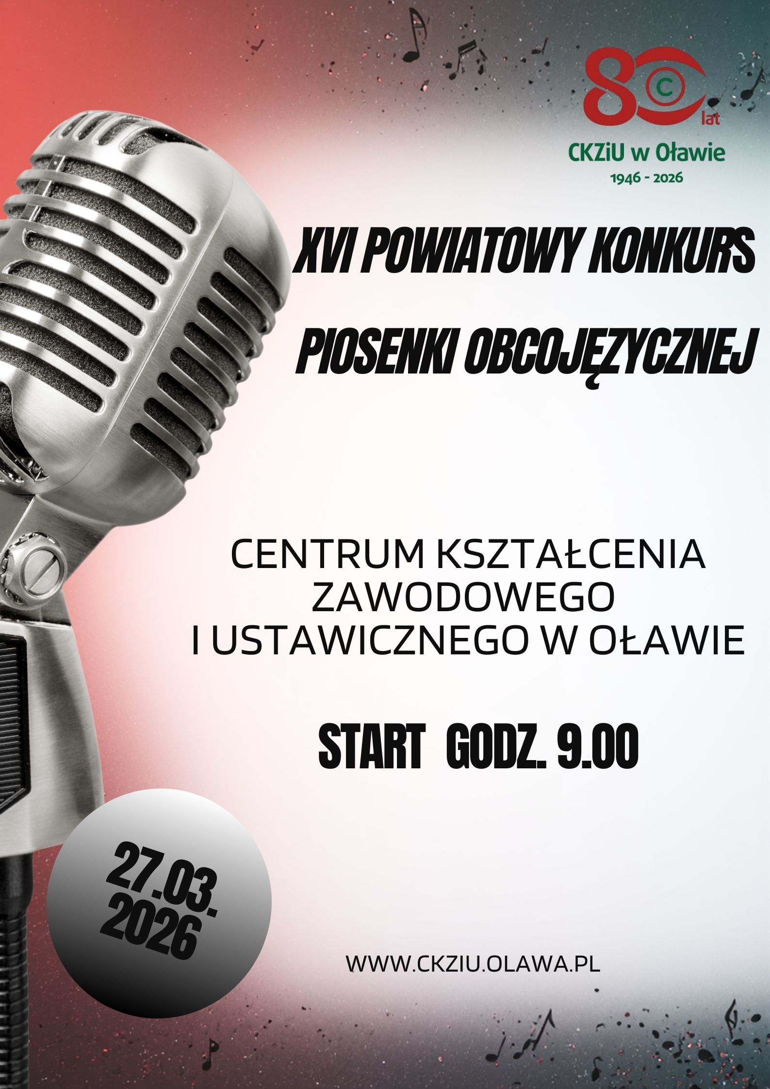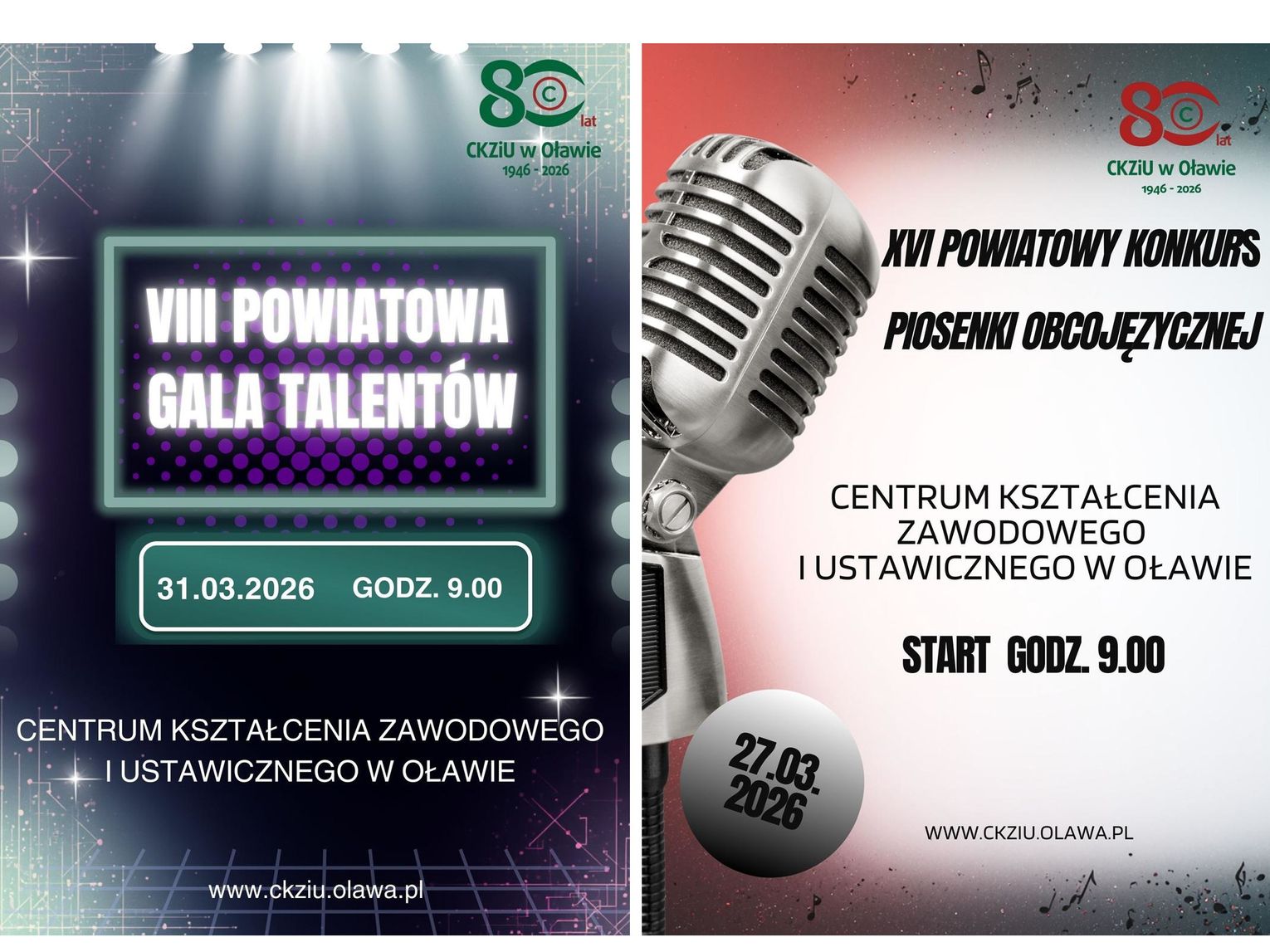 Konkurs "Talent Roku 2026" skierowany do uczniów szkół podstawowych klas: 4 – 8 oraz uczniów szkół ponadpodstawowych z powiatu oławskiego, natomiast Powiatowy Konkurs Piosenki Obcojęzycznej adresowany do uczniów szkół ponadpodstawowych, oraz klas 7 i 8 szkół podstawowych z powiatu oławskiego. Oba konkursy organizowane są w ramach obchodów 80-lecia CKZiU.
