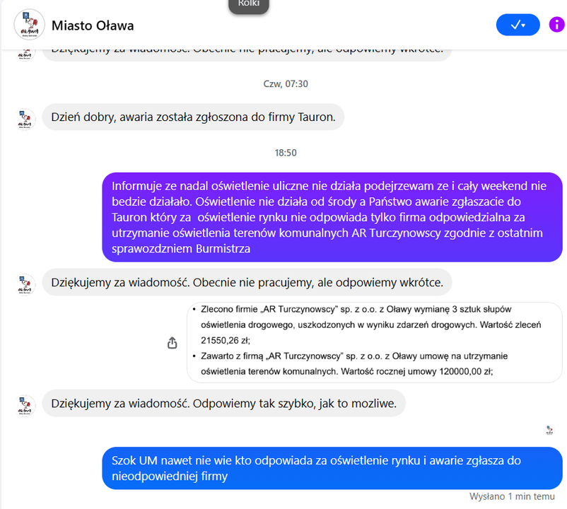Parę dni temu opublikowaliśmy list pana Wojciecha Woźniaka, który napisał: - Nieoświetlone od środy są wszystkie ulice wokoło Rynku i kościoła MBP, np. ulica Wrocławska, Brzeska, Browarniana, Kościuszki, Krótka, Plac Starozamkowy. Od poniedziałku wymienione ulice nie mają oświetlenia. Zgłosiłem to w środę do UM Oława. Od tego czasu walczą z tematem i zgłaszają do Taurona, który z nowym oświetleniem Rynku po remoncie nie ma nic wspólnego. Pracownicy UM zgłaszają awarie nie do odpowiedniej firmy.