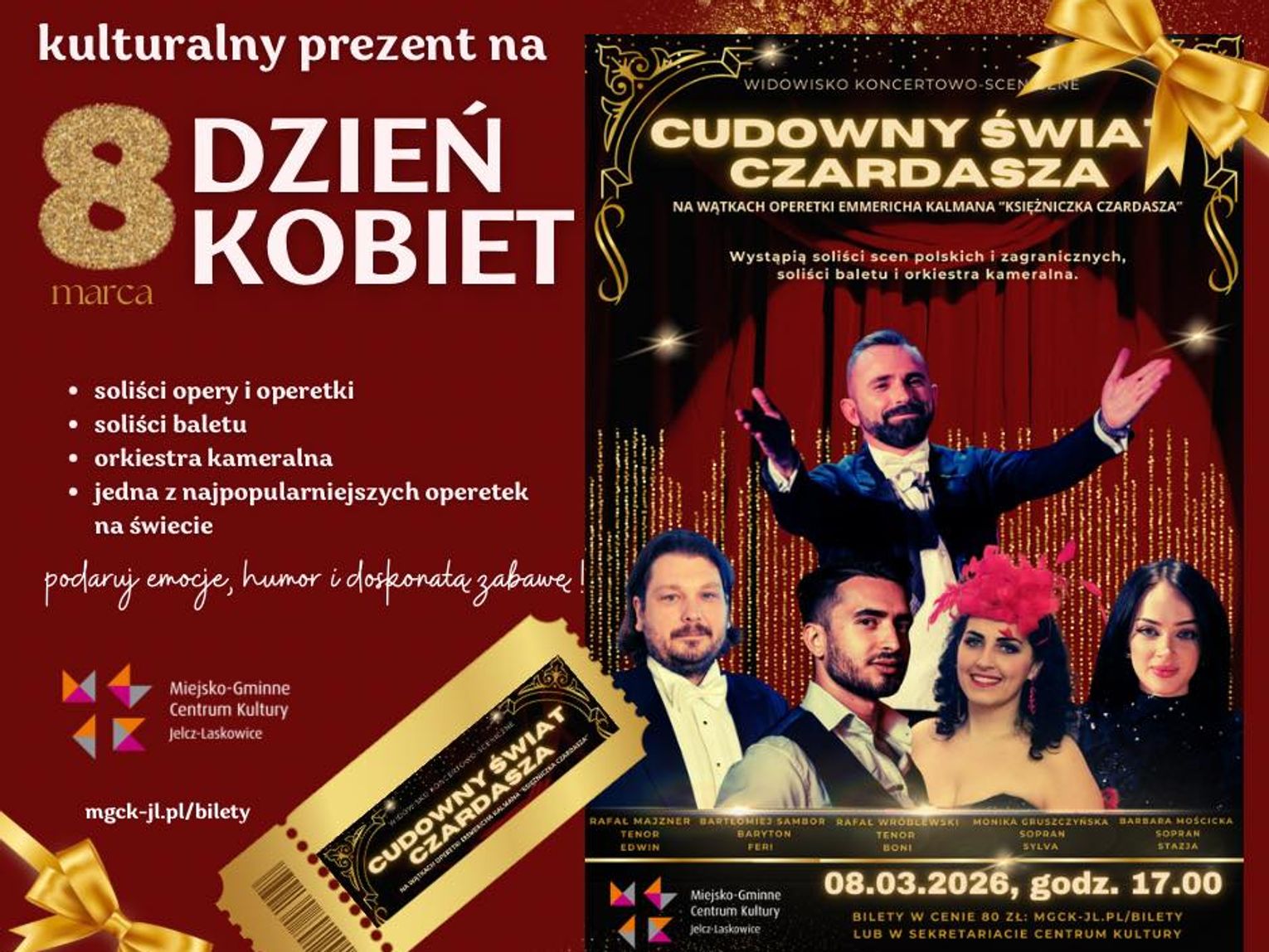 8 marca w Centrum Kultury w Jelczu-Laskowicach odbędzie się niezwykłe wydarzenie muzyczne - „Cudowny świat czardasza”. To pełen pasji koncert inspirowany żywiołową muzyką węgierską, porywającymi melodiami i taneczną energią, która rozgrzewa serca od pierwszych dźwięków. To idealny prezent dla mamy, żony, babci, przyjaciółki… albo dla samej siebie. Nastrojowa muzyka, wirtuozerskie wykonania i wyjątkowa atmosfera sprawią, że ten wieczór będzie naprawdę magiczny.