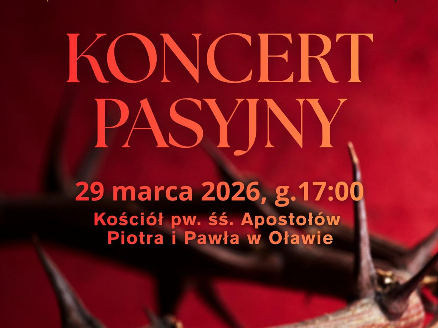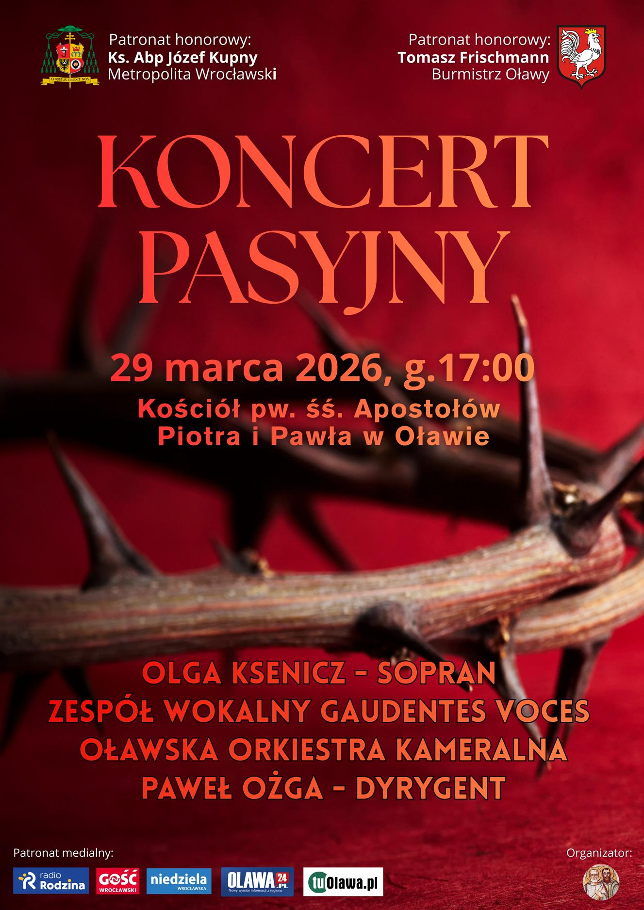 W Niedzielę Palmową – 29 marca 2026 roku o godz. 17:00 w kościele pw. Świętych Apostołów Piotra i Pawła w Oławie odbędzie się Koncert Pasyjny w wykonaniu Zespołu Wokalnego Gaudentes Voces oraz Oławskiej Orkiestry Kameralnej pod dyrekcją Pawła Ożgi.