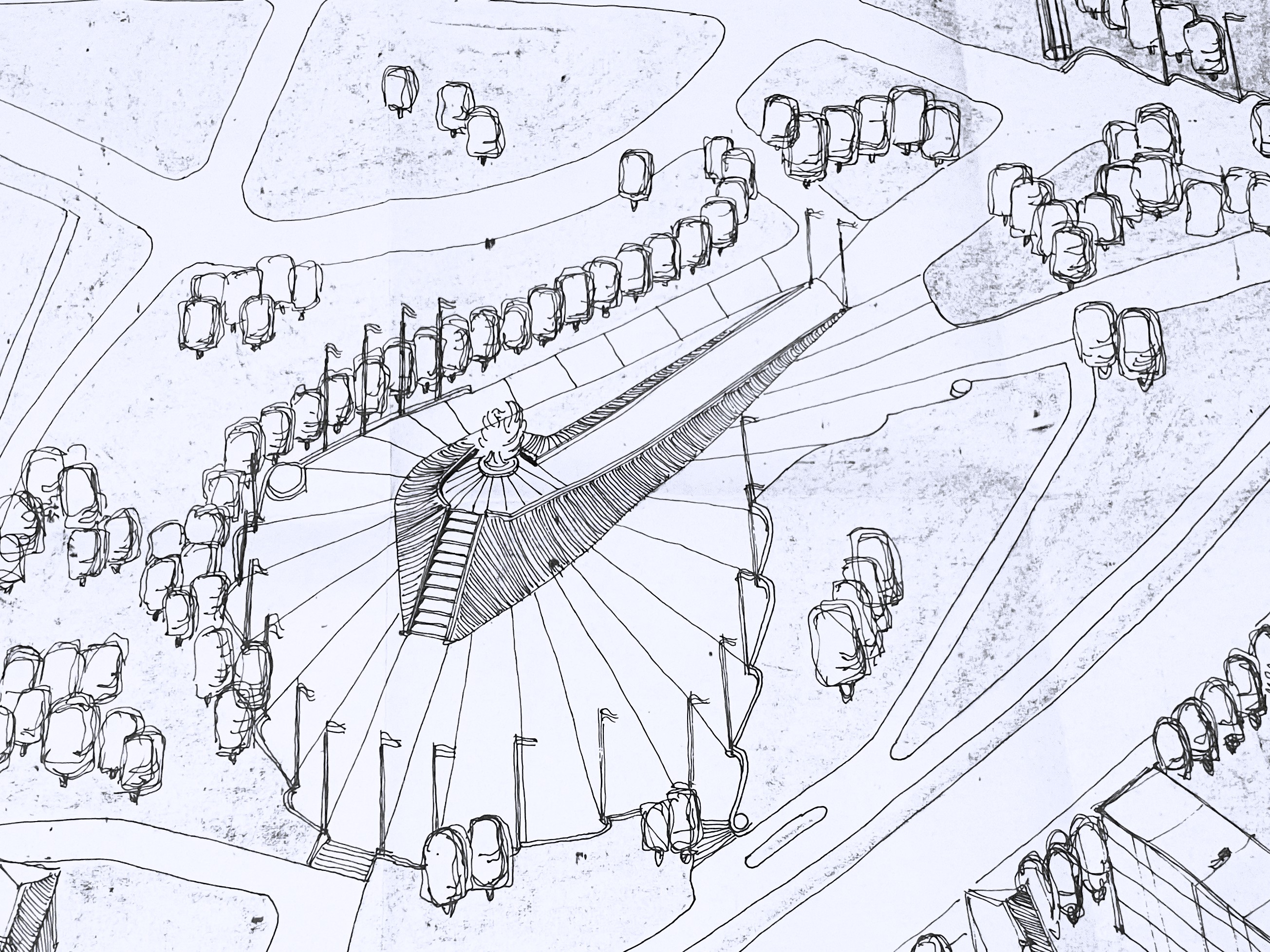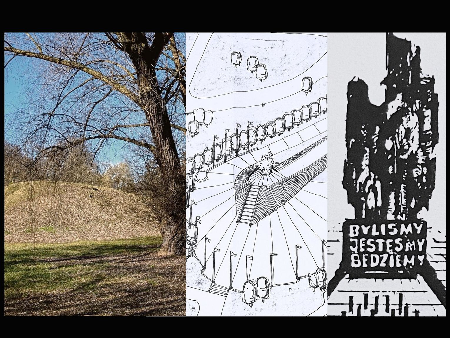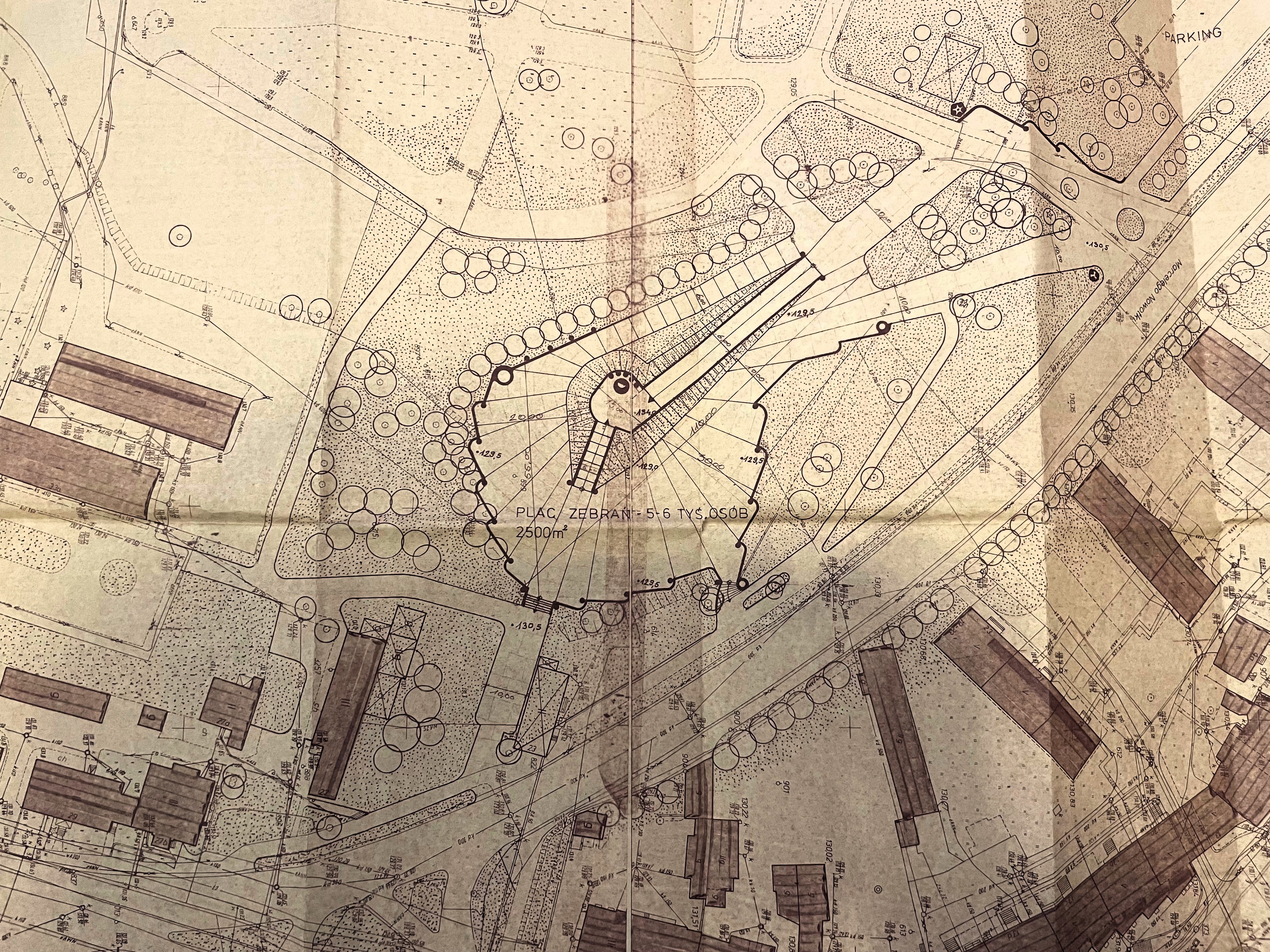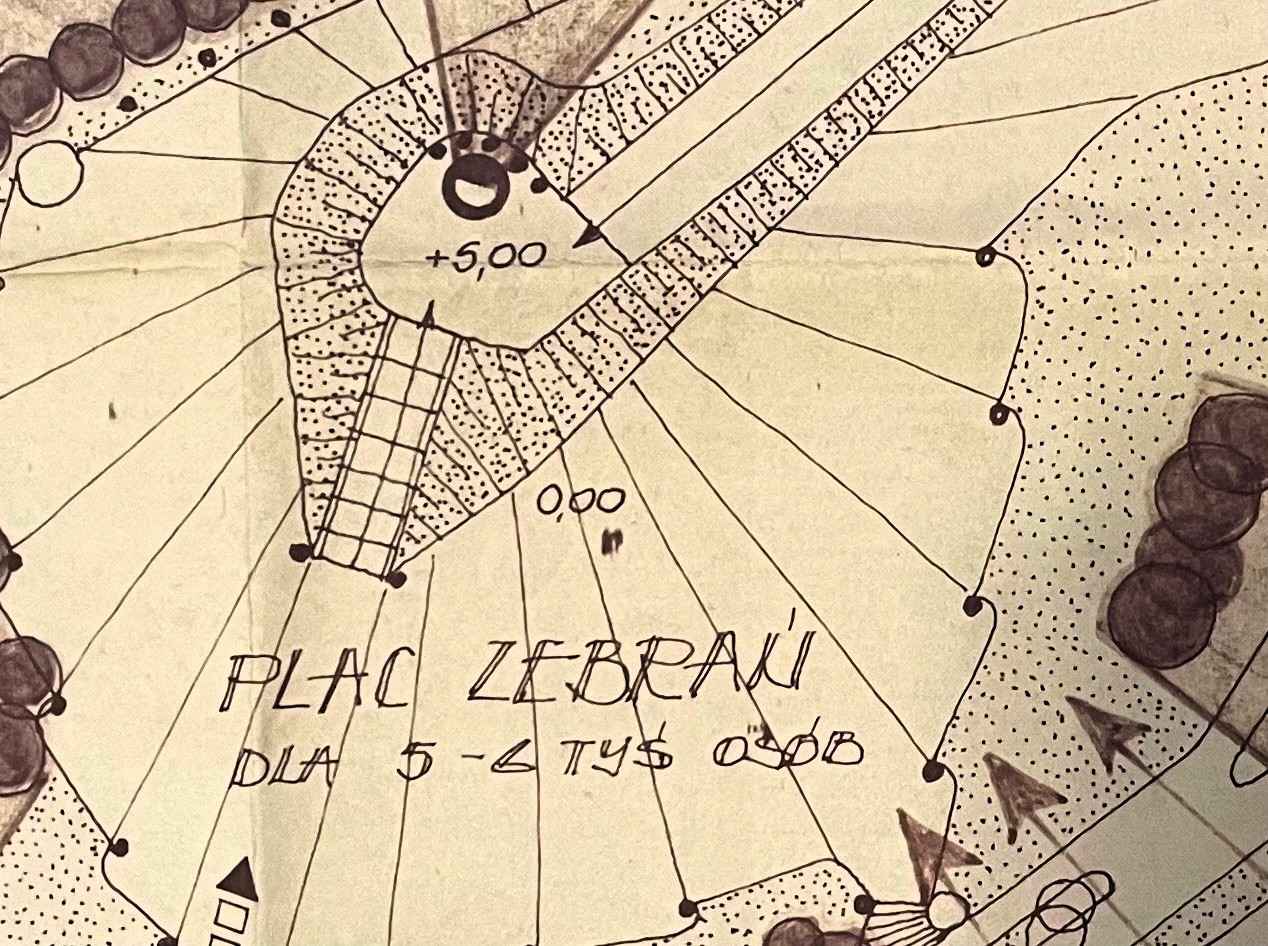 Oddajmy głos nowym projektantom nowego założenia, tym razem ze Stowarzyszenia Architektów Polskich: - Usytuowanie placu zebrań od strony wschodniej umożliwi oglądanie go w pełnym świetle słonecznym do godziny 13.00. Przy uroczystościach programowanych wieczorem wchodzi w grę światło sztuczne, iluminacja przy pomocy reflektorów. W takich wypadkach usytuowanie pomnika względem stron świata nie ma znaczenia (cenna uwaga - przyp. red.). Nasyp posiada dwa wejścia, równię pochyłą o długości 40 i szerokości 6 metrów, a od strony przeciwległej schody o długich o lekko pochyłych stopniach, o długości 15 metrów, które będą głównym wejściem dla delegacji biorących udział w ceremonii składania wieńców pod pomnikiem. Plac zebrań zaprojektowano w formie wachlarza, nawiązując do kierunku patrzenia uczestników uroczystości (na pomniki).