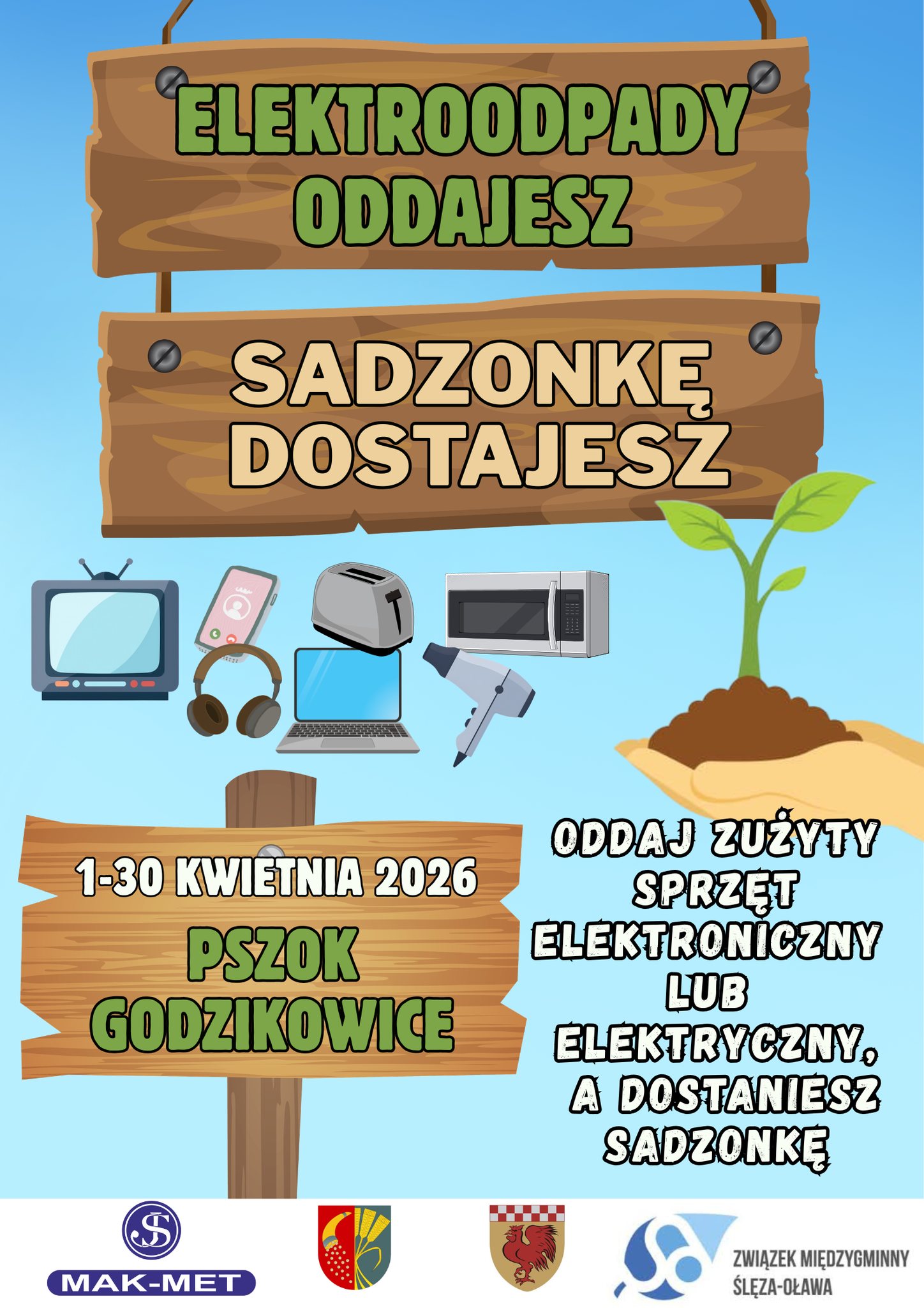 To wspólna akcja Gminy Oława, Gminy Domaniów, Związku Międzygminnego Ślęza Oława oraz PHU MAK-MET, który prowadzi PSZOK w Godzikowicach. Masz w domu zużyty sprzęt elektryczny lub elektroniczny? Oddaj go tam i odbierz coś w zamian!