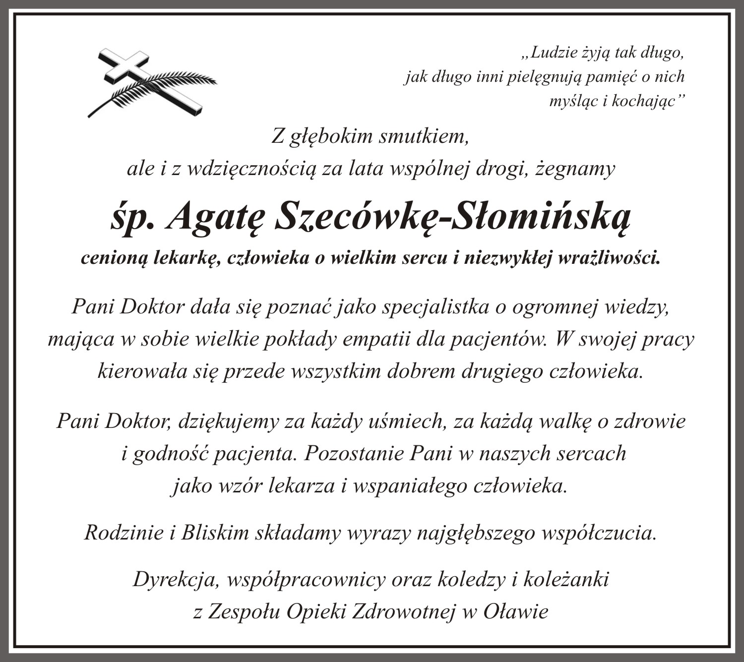 - Zgodnie z Jej osobistą decyzją i ostatnią wolą, uczestnicy uroczystości pogrzebowej zostali poproszeni o to, aby zamiast składania kwiatów, przekazali datki na cel charytatywny - informuje ZOZ. - Dzięki hojności wszystkich zgromadzonych, do puszki trafiła kwota 13 000 złotych. Całość zebranych środków została już wpłacona na rzecz Zakładu Opiekuńczo-Leczniczego w ZOZ w Oławie. Te pieniądze realnie wspomogą opiekę nad pacjentami, stając się żywym pomnikiem pamięci o Pani Doktor – o osobie, która przez całe życie niosła pomoc innym, i czyni to nadal, nawet po swoim odejściu. Składamy serdeczne podziękowania Rodzinie zmarłej Pani Doktor za realizację tej szlachetnej woli. Państwa postawa pozwoliła przekuć smutek po stracie w wymierne dobro. Dziękujemy również wszystkim uczestnikom pogrzebu za każdy datek. To dzięki Państwa ofiarności ZOL otrzymał finansowe wsparcie.