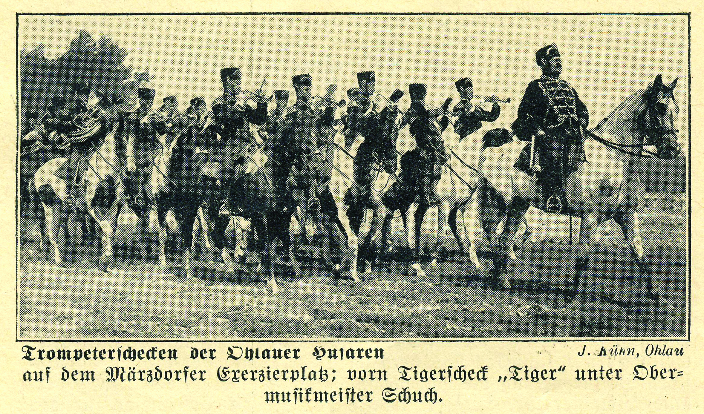 "Siekacze mięsa" z Ohlau mieli bardzo charakterystyczny i jedyny w całej niemieckiej armii pododdział trębaczy. Dosiadali oni wyłącznie srokatych koni. Koniuszy krajowy Bilke z Moritzburga w Deutsche Kavallerie-Zeitung (rocznik 13, nr 12/1940, str. 171), tak wspomina te zwierzęta i jeźdźców: - Przez całe lata oławianie mogli przyzwyczaić się do widoku huzarów, ale mimo to niezmiennie podbiegali do okien i drzwi, gdy ci nadjeżdżali. Szwadrony wkraczały do miasta zawsze od strony innej dzielnicy i innymi ulicami. Zmieniały też między sobą kolejność, z jaką wjeżdżały za kroczącym na przedzie pododdziałem trębaczy na srokatych koniach. Poszczególni rotmistrzowie mieli swe ulubione melodie - nie tylko marsze. Grano także walce i czasami po utworze muzycznym można było rozpoznać nadciągający oddział. Bawiące się lub odrabiające właśnie lekcje dzieci, słysząc stłumione brzmienie bębnów zwiastujące zbliżanie się huzarów, porzucały wszystko i biegły im na spotkanie. (...) Gdy wymarsz pułku z towarzyszeniem muzyki odbywał się wcześnie rano, chłopcy i dziewczęta rzucali się do okien. To właśnie huzarzy winni byli temu, że ten i ów spóźnił się tego dnia do szkoły. Kiedy zaś w południe huzarzy powracali z ujeżdżalni na Schloßwiese (Zamkowej Łące) lub z placu musztry w Marcinkowicach (niem. Märzdorf), a muzykę trębaczy słychać było w gimnazjum, była to dla uczniów zawsze mile widziana przeszkoda w lekcjach - większość nauczycieli przerywała wtedy zajęcia, a młodzież oblegała okna.