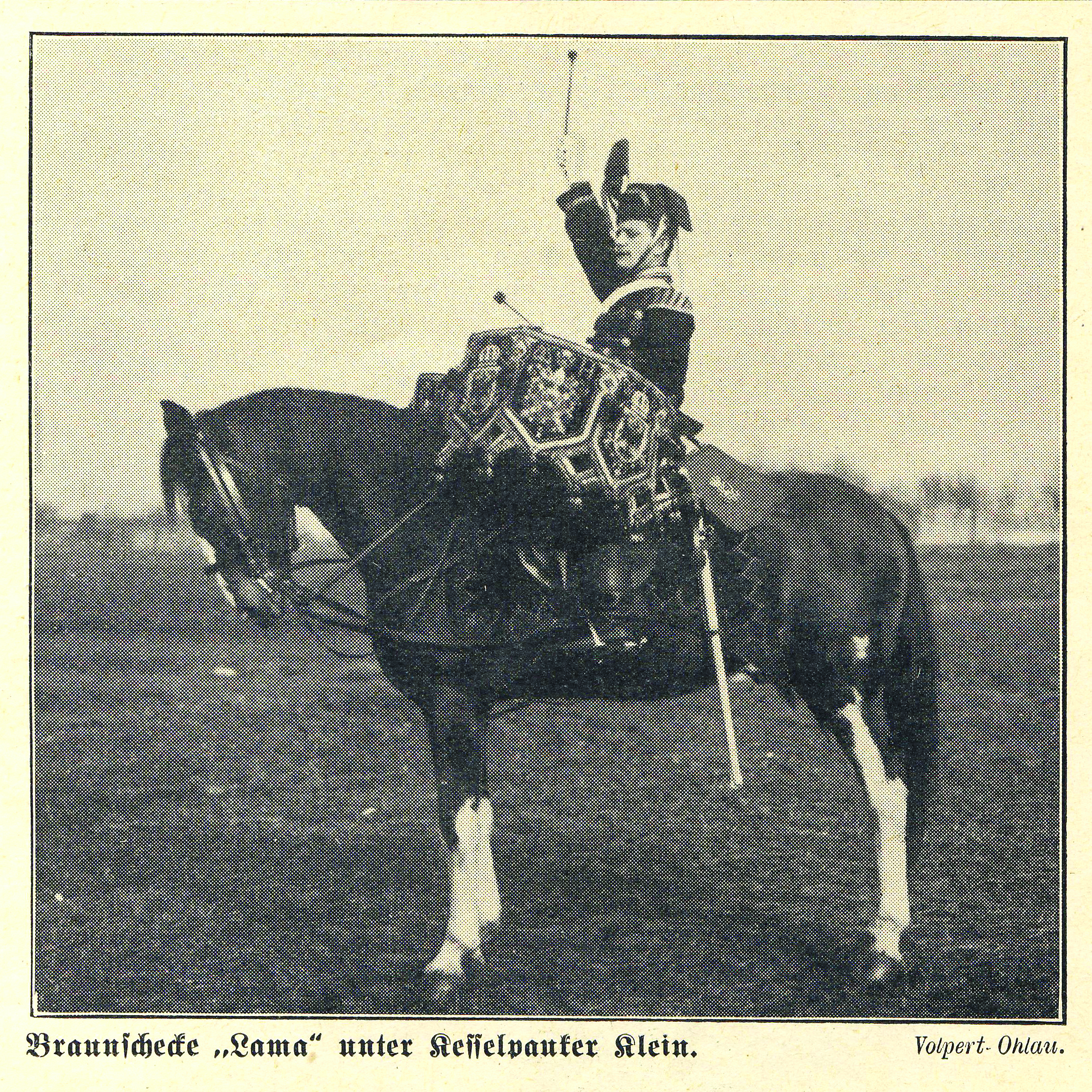 Oprócz koni-doboszy kilka srokaczy służyło w oławskich szwadronach za "zapasowych trębaczy". Zapotrzebowanie na łaciate konie dla pułku w Ohlau stale rosło. Na potrzeby tutejszego regimentu w wielkich hodowlach w Prusach Wschodnich i w Prowincji Poznań.wyszukiwano rzadkie źrebięta o srokatym umaszczeniu. Kilka wyspecjalizowanych stajni, korzystających z zasobów genetycznych stadniny Trakehnen (dziś Jasnaja Poljana w Obwodzie Kaliningradzkim - przyp. tłum), wyspecjalizowało się w rozrodzie łaciatych źrebiąt wyłącznie dla huzarów von Schilla. Były wśród nich srokacze brązowe, czarne, bułane, porcelanowe, tygrysie i inne.