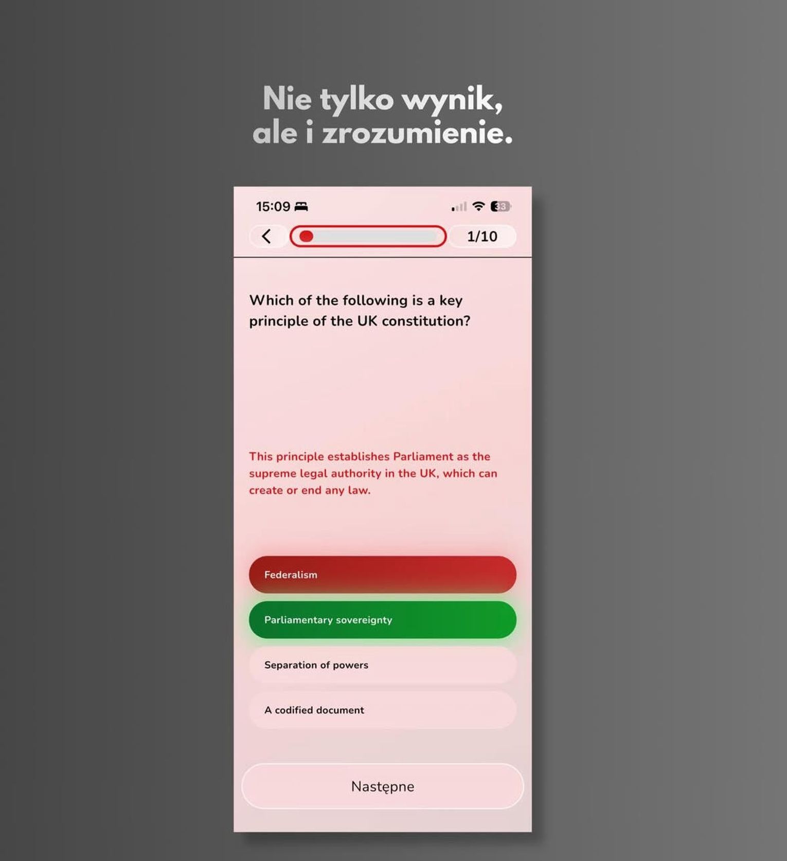 Aplikacja jest intuicyjna, działa offline i ma wbudowany kalendarz, który pozwala śledzić postępy i czas nauki. Co ważne, do nauki i powtarzania materiału można wracać w dowolnym momencie.