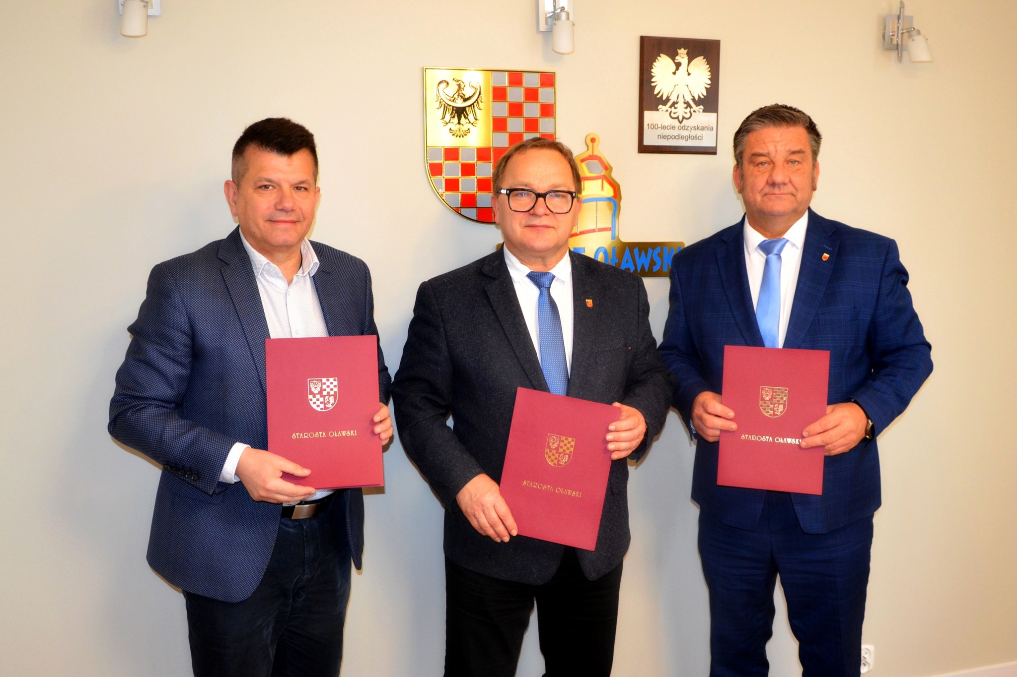 W Starostwie Powiatowym spotkali się starosta Marek Szponar, burmistrzem Oławy Tomasz Frischmann i wójtem gminy Oława Artur Piotrowski, by podpisać umowę dotacji na realizację inwestycji drogowej pn. „Budowa ciągu pieszo rowerowego – ul. Kilińskiego w Oławie, droga nr 1574D”.