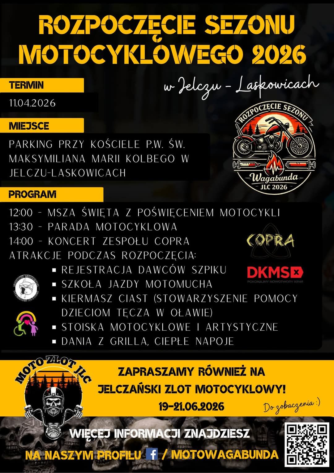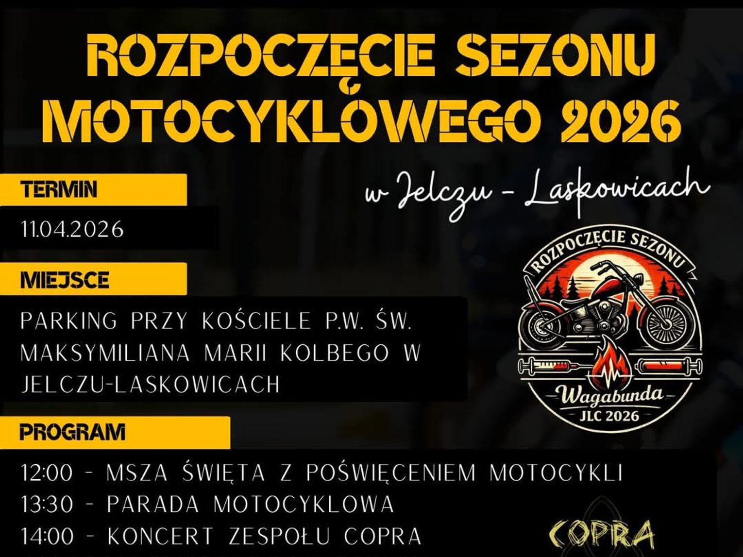 Podczas imprezy zagra dla Was wrocławski zespół CoprA, grający w klimacie ogólnie pojętego rocka. Czasami melancholijnie, a czasami mocno. Zresztą, przekonacie się sami - CoprA zagra o godzinie 14:00. Gdzie? Wszystkie atrakcje na parkingu przed kościołem pw. św. MM Kolbego w Jelczu-Laskowicach. W tym kościele o 12.00 rozpocznie się msza, podczas której odbędzie się poświęcenie motocykli.