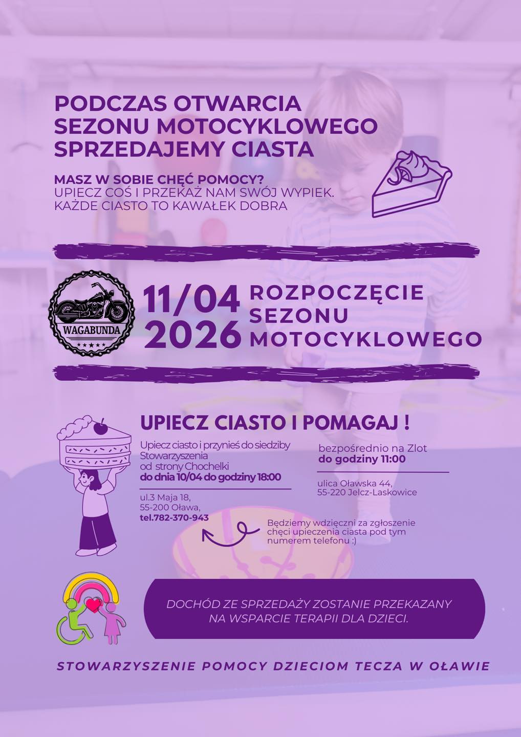 Podczas imprezy czeka Was charytatywna sprzedaż ciast! Jeśli chcesz pomóc i dołożyć swoją cegiełkę do wsparcia rehabilitacji dzieci ze Stowarzyszenia Pomocy Dzieciom Tęcza w Oławie - upiecz ciasto i przynieś je w piątek do godz. 18:00 do siedziby stowarzyszenia lub bezpośrednio na imprezę (ul. Oławska 44, Jelcz-Laskowice) do godz. 11:00.