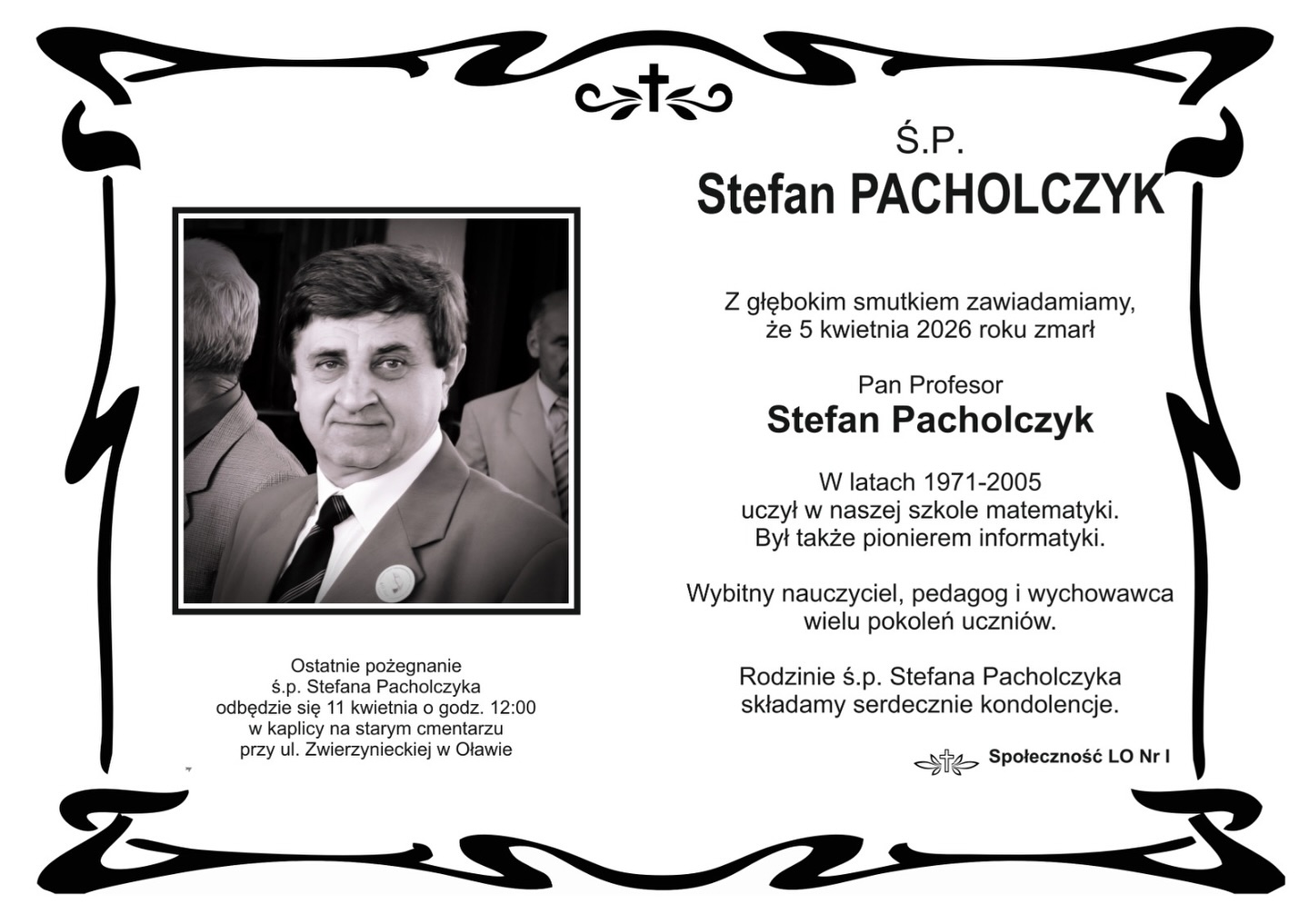Z wielkim bólem żegnamy zasłużonego nauczyciela matematyki w Liceum Ogólnokształcącym Nr I im. Jana III Sobieskiego, wychowawcę i serdecznego kolegę – Pana Profesora Stefana Pacholczyka.