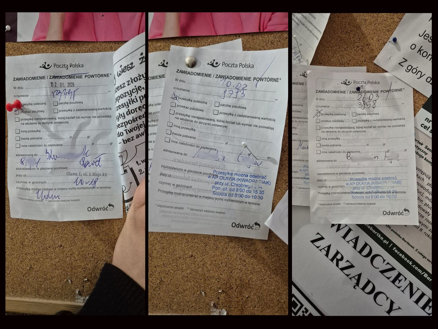 Teraz doszedł kolejny kłopot, który sygnalizuje nam pani Magda z Oławy: - Wracając tematem jeszcze do Poczty Polskiej chciałabym zwrócić dodatkowo uwagę, że nagminnie do naszej skrzynki na ul. 3 Maja 8A zostaje wrzucane awizo do osób, które... tutaj nie mieszkają. Prosimy o udostępnienie na portalu, bo może ktoś czeka akurat na przesyłkę. Są na tablicy przypięte w klatce na 3 Maja 8A.