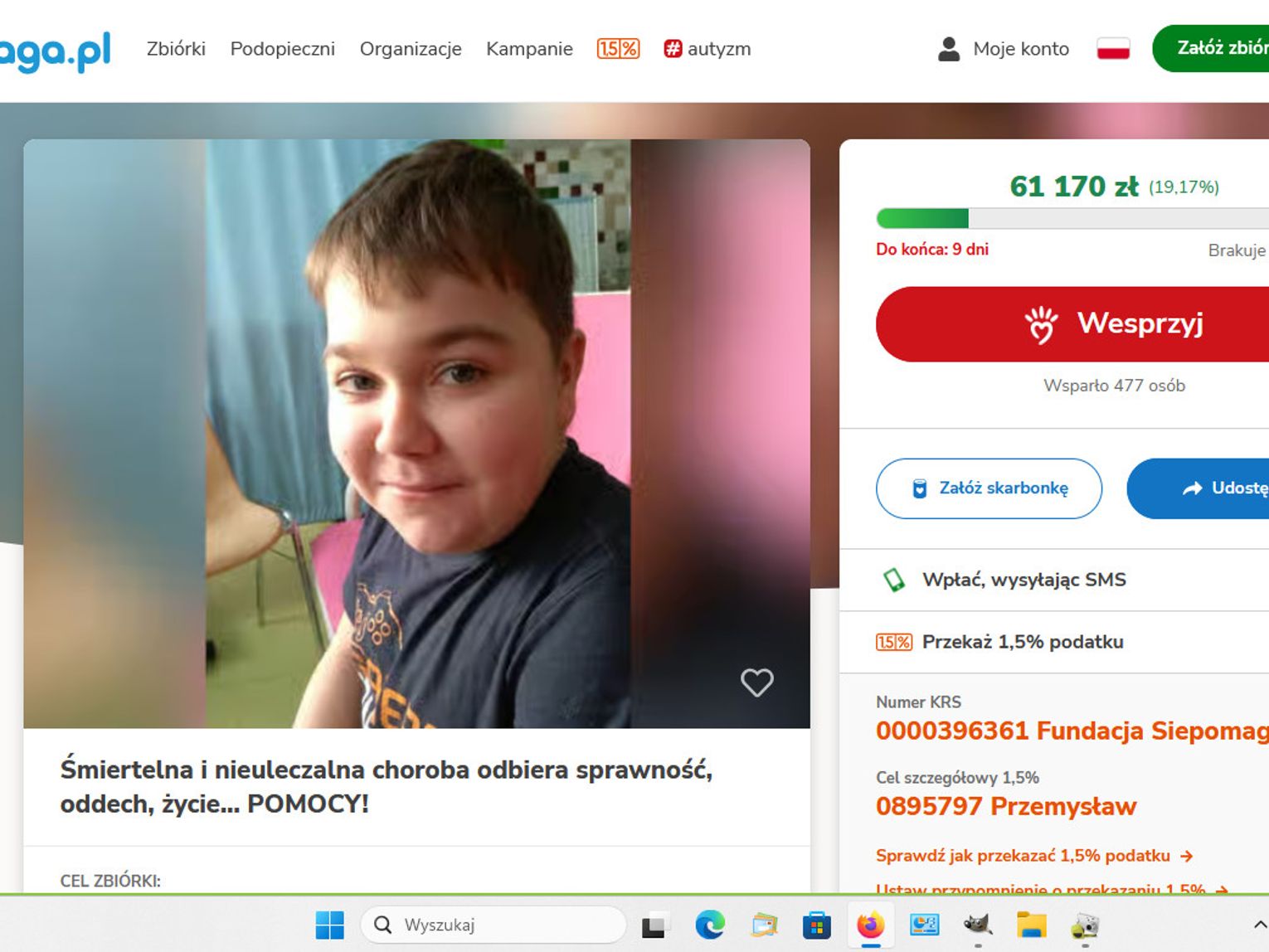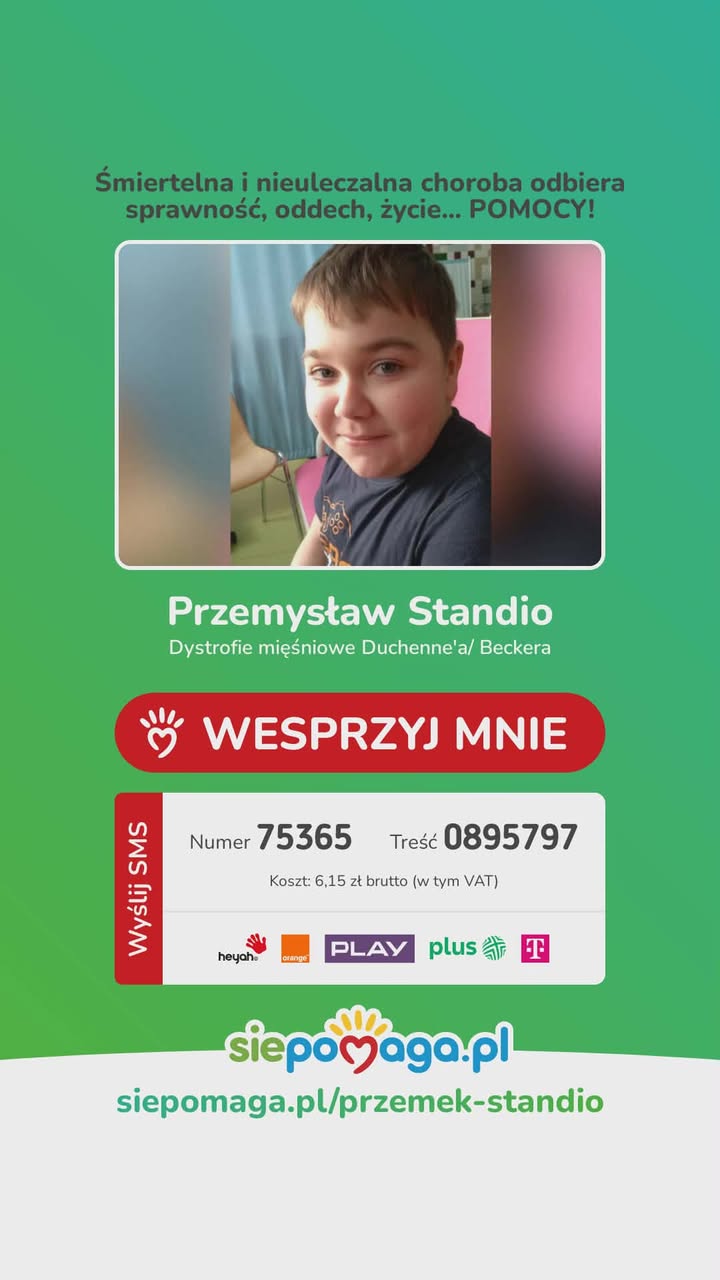 Przemek choruje na nieuleczalną obecnie i śmiertelną chorobę jaką jest dystrofia mięśniowa Duchenne'a. Jest to choroba genetyczna w której organizm nie produkuje dystrofiny - białka potrzebnego do budowy mięśni i ich regeneracji. Przemek już od kilku lat nie chodzi, porusza się wyłącznie na wózku. W chwili obecnej prowadzimy zbiórkę w Fundacji Siepomaga na auto przystosowane do przewozu osoby niepełnosprawnej. Auto dzięki któremu będzie można wjechać przez bagażnik samochodu wózkiem po specjalnej rampie. Z uwagi na lata noszenia syna i wkładania do samochodu zaczęły mi się problemy z kręgosłupem. Nieraz ból jest tak mocny, że nie mogę chodzić. Zakup tego samochodu, jak ktoś może sobie pomyśleć, to nie luksus. W tej chwili to rzecz, która sprawi, że nasze życie chociaż z pozoru będzie wyglądało normalnie. Pozwoli nam bez problemu przemieszczać się po kraju w celu wizyt u lekarzy specjalistów m.in. do kardiologa w Zabrzu, Uniwersyteckiego Dziecięcego Szpitala Klinicznego w Białymstoku czy zwyczajnie po Oławie na zajęcia rehabilitacyjne. Mamy też szansę dostać się do badań klinicznych nad lekiem spowalniającym chorobę i w tym przypadku już w maju udamy się do Berlina na badania kwalifikujące. Stąd zakup takiego samochodu to rzecz bardzo pilna. Jego koszt to 300 tysięcy złotych i przewyższa nasze możliwości. Musimy niestety zdać się na łaskę ludzi o dobrych sercach. Zbiórkę prowadzimy pod tym linkiem https://www.siepomaga.pl/przemek-standio a pod poniższymi linkami prowadzimy aukcje charytatywne na ten cel.