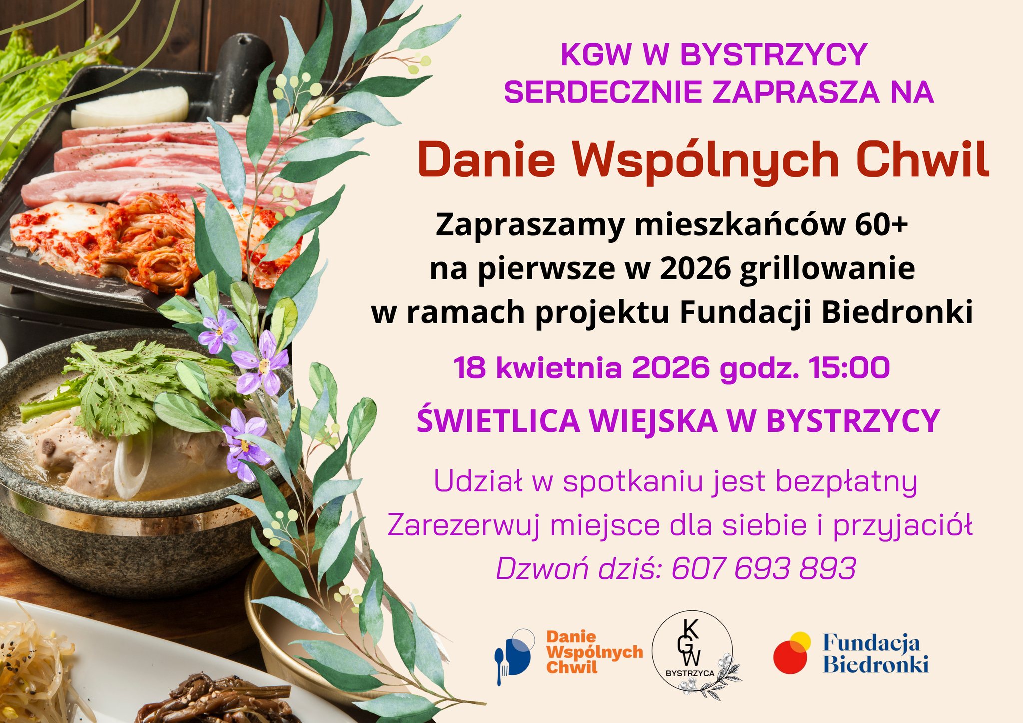 Uwaga: zapisy są wymagane, żebyśmy wiedzieli, ile jedzenia przygotować. Napisz do nas lub zadzwoń pod numer 607 693 893 i zarezerwuj miejsce dla siebie.