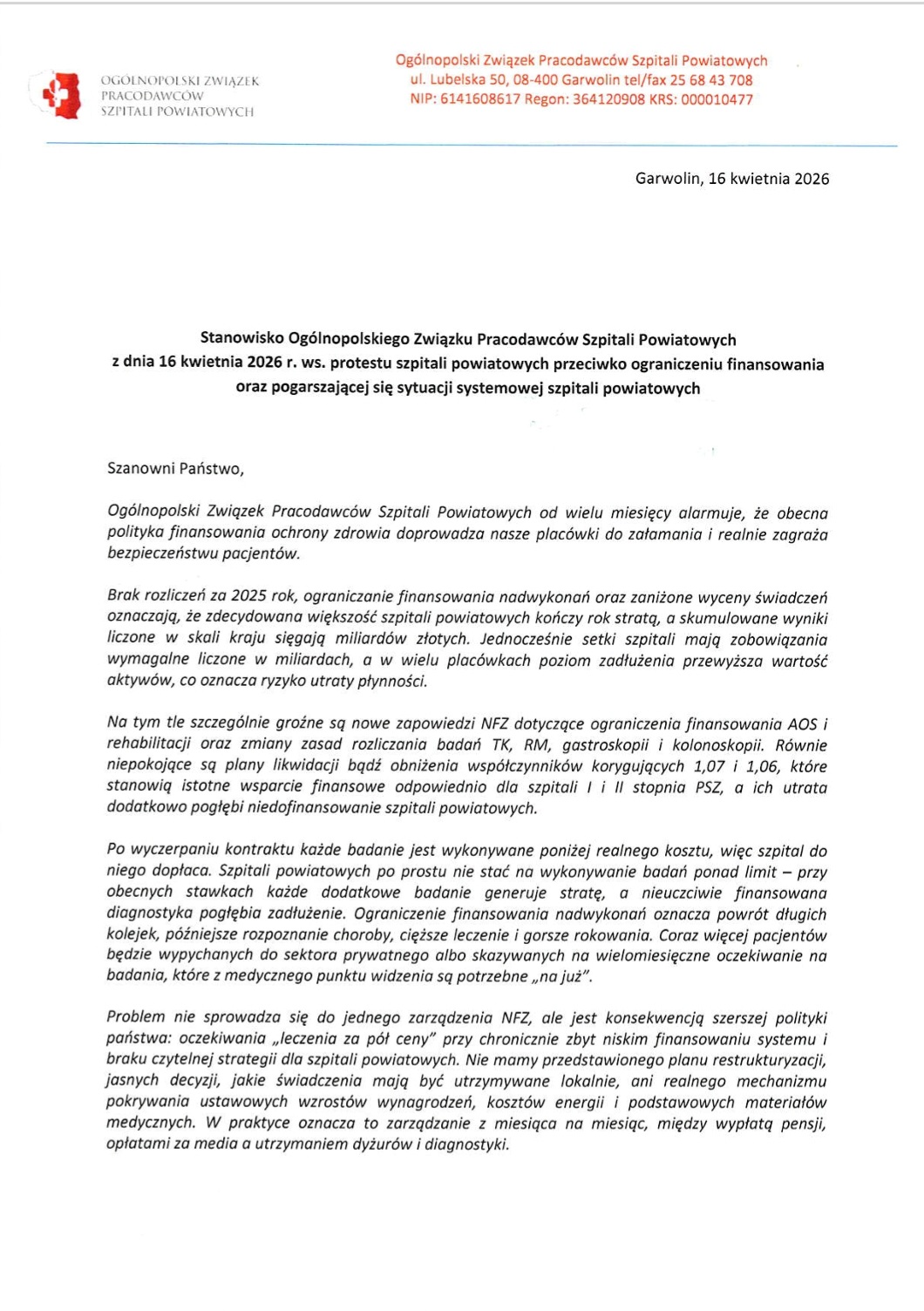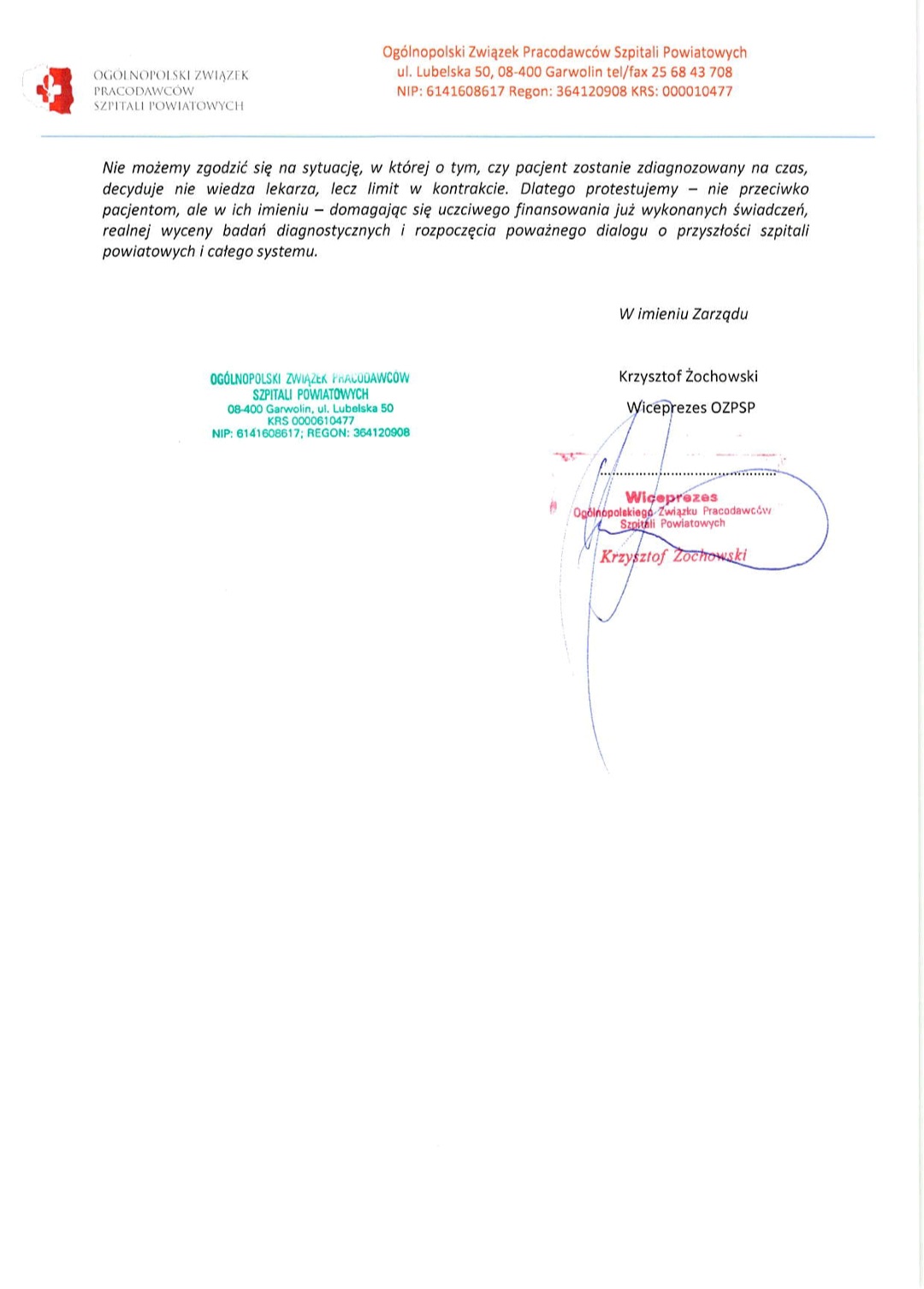 Zespół Opieki Zdrowotnej w Oławie, jako szpital powiatowy, popiera wszystkie postulaty Ogólnopolskiego Związku Pracodawców Szpitali Powiatowych. Również nas dotyczą plany NFZ poruszone w liście OZPSP, których wprowadzenie w życie odbije się negatywnie także na naszych pacjentach.