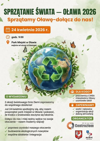 - To świetna okazja, żeby zrobić coś realnie dobrego dla miasta – a przy okazji spędzić czas w fajnej atmosferze zachęca Miasto. - Nie musisz się przygotowywać, zapewniamy worki i rękawice, ogarniamy organizację, Ty przynosisz tylko chęci. Dla kogo? Dla każdego – weź znajomych, rodzinę albo wpadnij solo! Działamy z okazji Dnia Ziemi – pokażmy, że Oława potrafi!