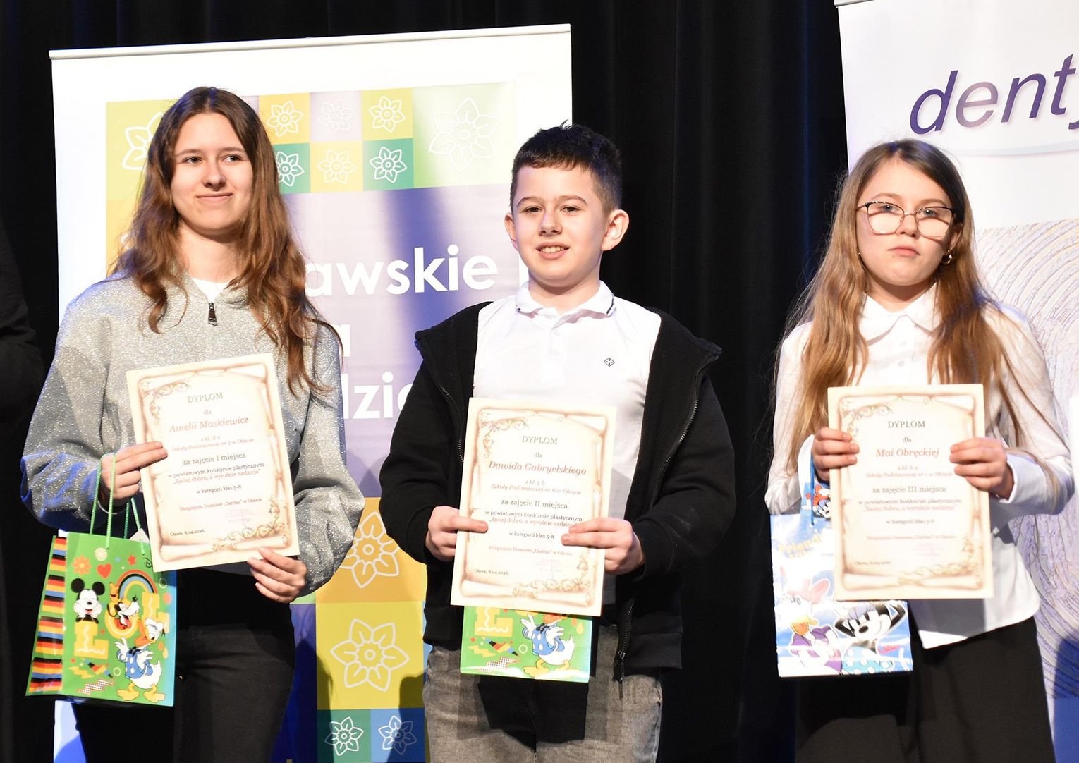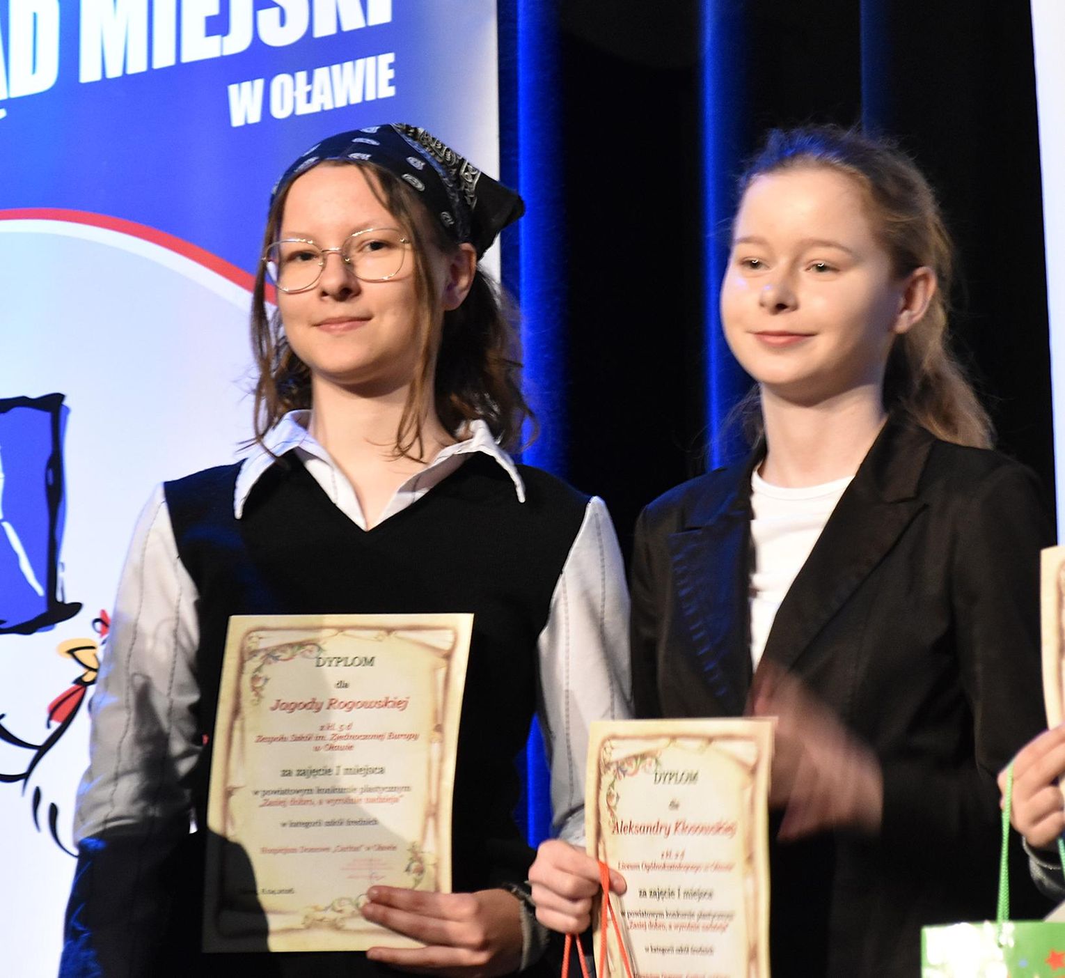 Wśród uczniów szkół średnich nagrodzono tylko dwie prace. Obie zajęły pierwsze miejsce. Wykonały je Aleksandra Kłosowska z kl. 2 LO w Oławie oraz Jagoda Rogowska z kl. 5 ZS im. Zjednoczonej Europy w Oławie. Wszyscy uczestnicy konkursu otrzymali pamiątkowe dyplomy, a w przerwie zaproszono ich na pizzę.