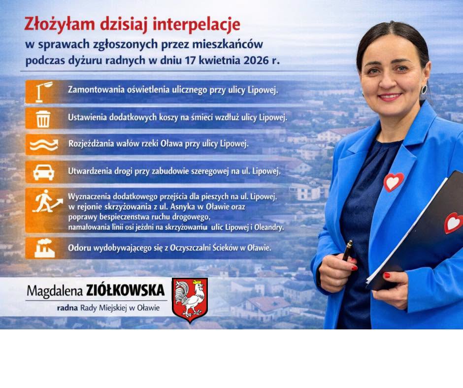 20 kwietnia radna poinformowała o złożonych interpelacjach: