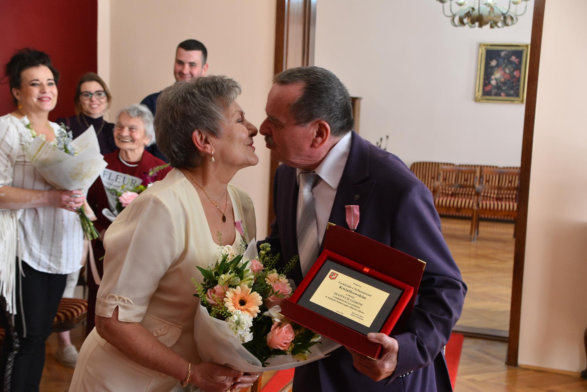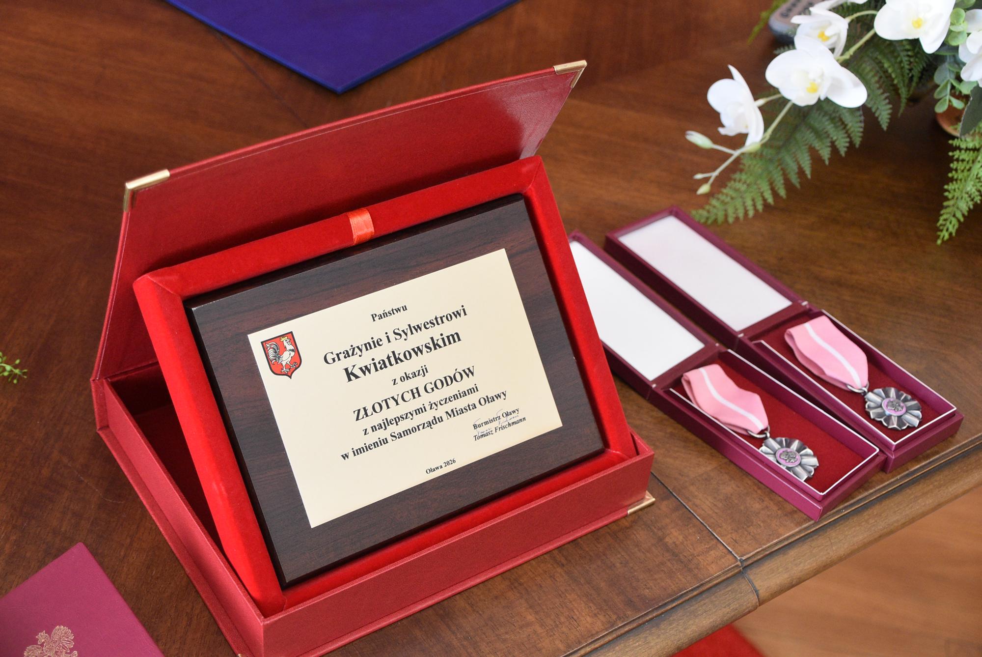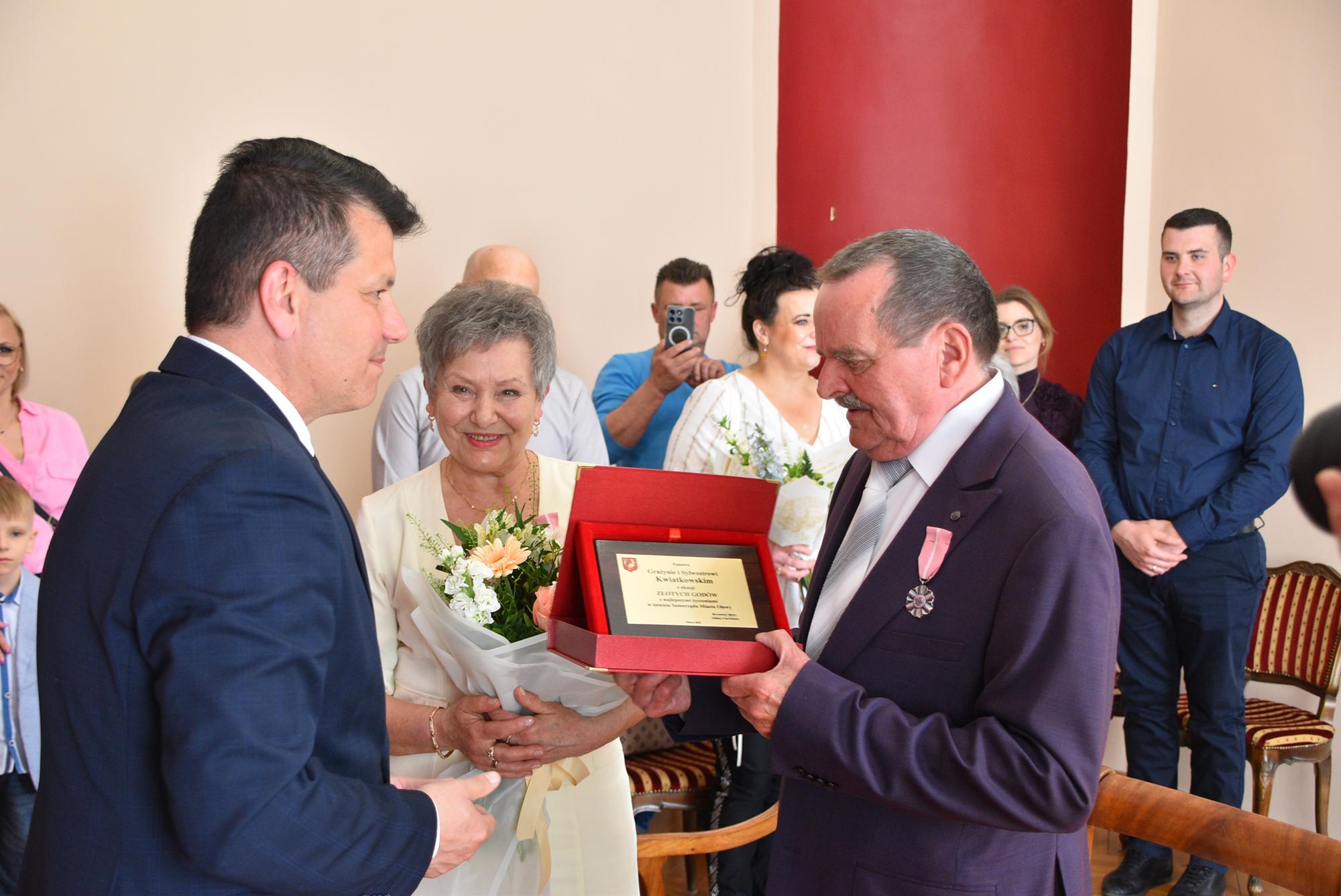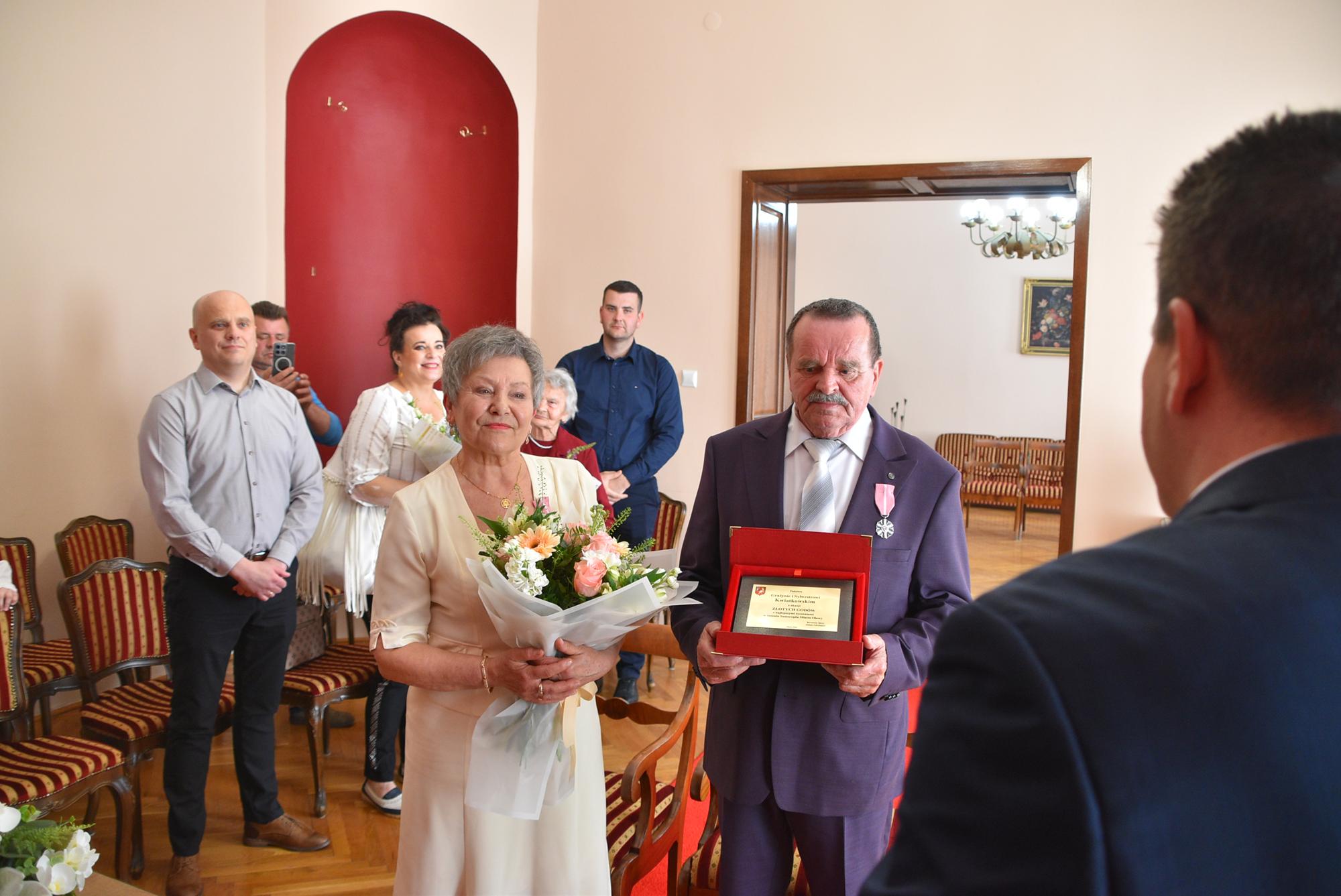 Podczas uroczystości w USC burmistrz Oławy Tomasz Frischmann przekazał Jubilatom medale przyznawane przez Prezydenta RP oraz pamiątkowy grawerton i bukiet kwiatów - w imieniu wszystkich mieszańców Oławy.