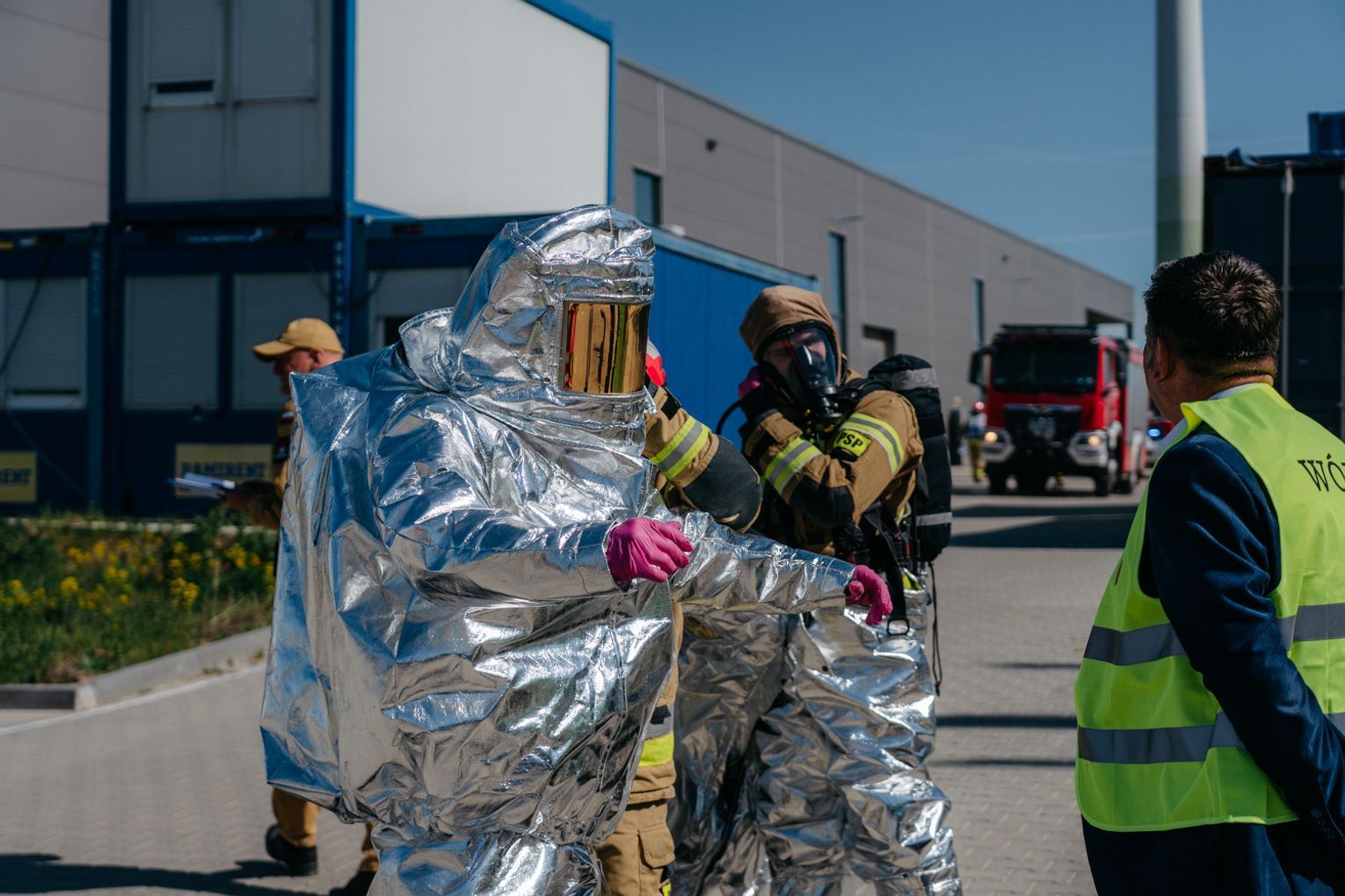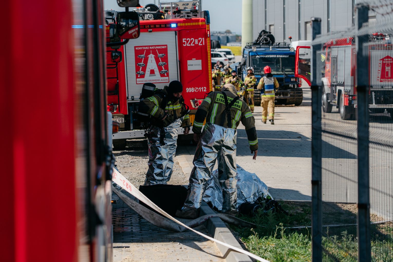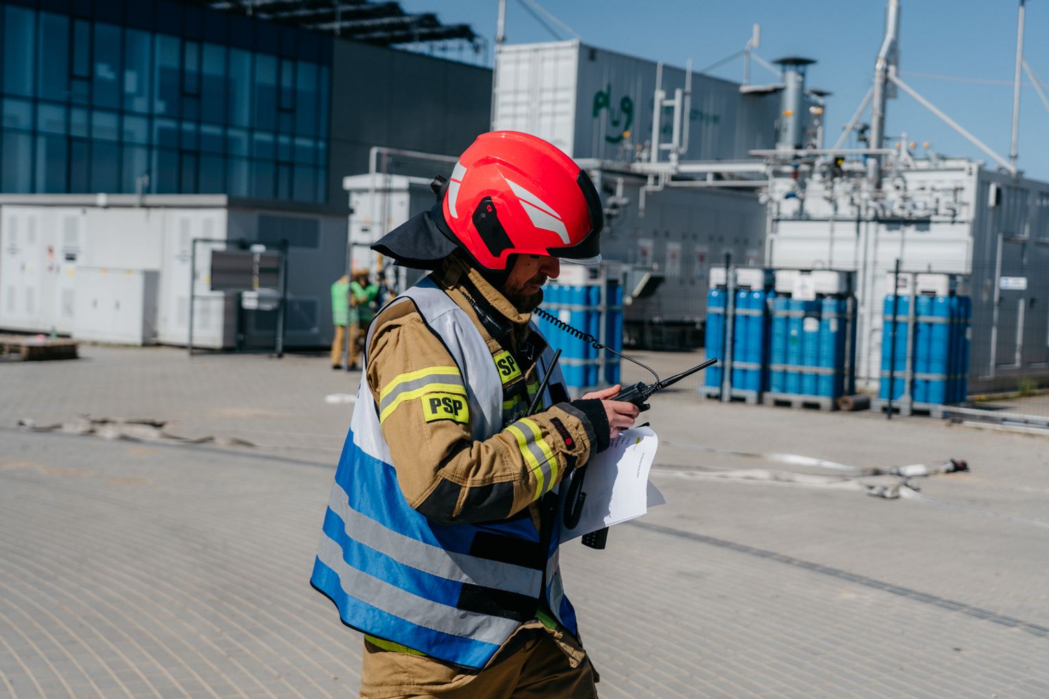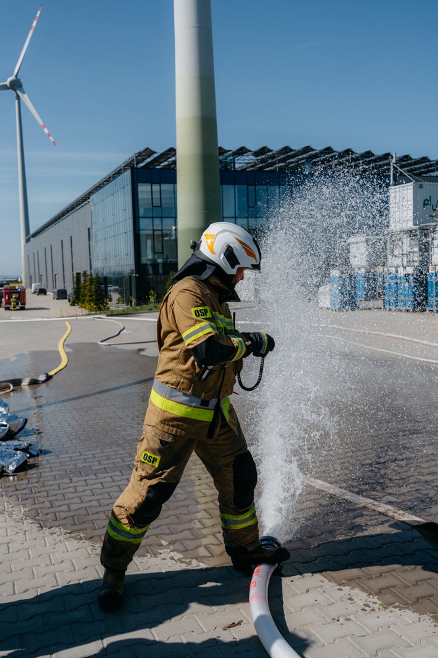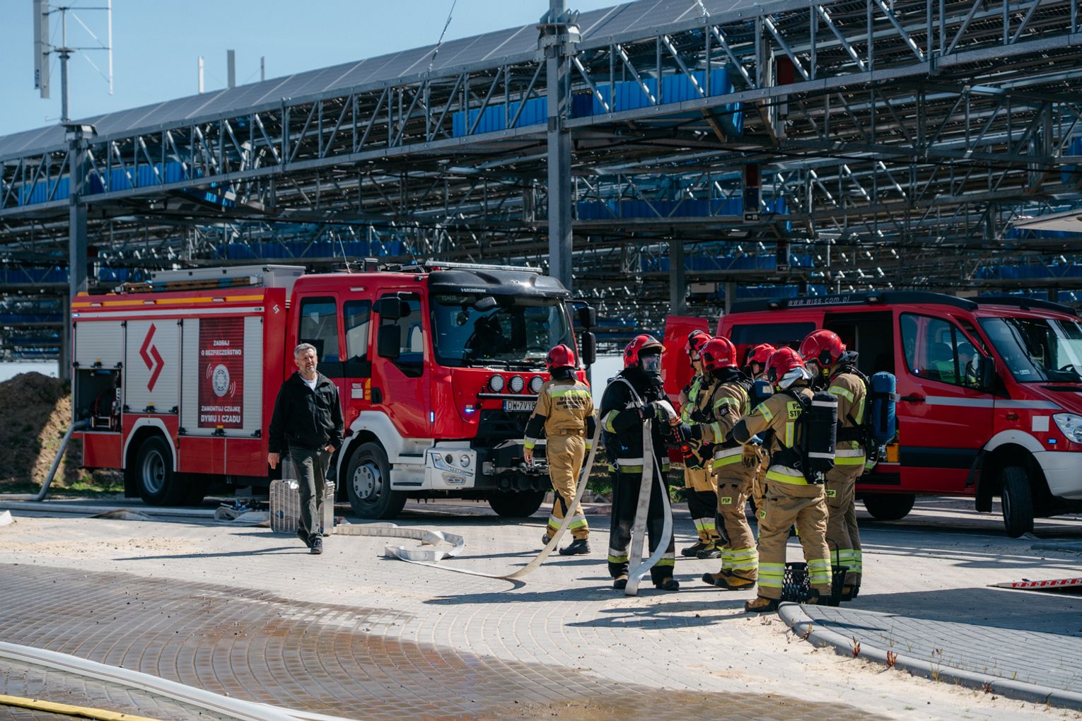 - Witam serdecznie na terenie gminy Oława, w Gaju Oławskim, w zakładzie Promet Plast. Korzystamy z gościnności właścicieli, aby przeprowadzić tegoroczne ćwiczenia powiatowe i sprawdzić gotowość służb ratowniczych do prowadzenia działań - mówił podczas odprawy komendant powiatowy PSP w Oławie mł. bryg. mgr inż. Bartłomiej Marcinów. - Temat przewodni to zdarzenie związane z instalacją wodorową, choć po drodze zadzieją się inne rzeczy, które finalnie doprowadzą do uszkodzenia instalacji wodorowej. Wspierają nas dziś strażacy z Oleśnicy, który pełnią funkcję rozjemców oraz funkcjonariusze z Wrocławia, którzy jako grupa chemiczna będą ćwiczyli podczas jednego z epizodów. Witam Policję, na czele z zastępcą komendanta oraz wszystkich strażaków z PSP oraz druhów-ochotników. Chociaż są to ćwiczenia, nie znamy do końca scenariusza, nie wiemy czego się spodziewać, a musimy przyjechać na miejsce i reagować. Życzę wszystkim, aby to co robimy było bezpieczne. Nie pozwólmy na to, by jakiekolwiek nieodpowiedzialne zachowanie doprowadziło do jakiegoś wypadku. Apeluję o pełne przestrzeganie zasad bezpieczeństwa, o wykonywanie poleceń dowódców, którzy są odpowiedzialni za bezpiecznie przeprowadzenie ćwiczeń. Na pewno nie wszystko się uda, a wnioski, które wypracujemy, po wszystkim wspólnie omówimy.
