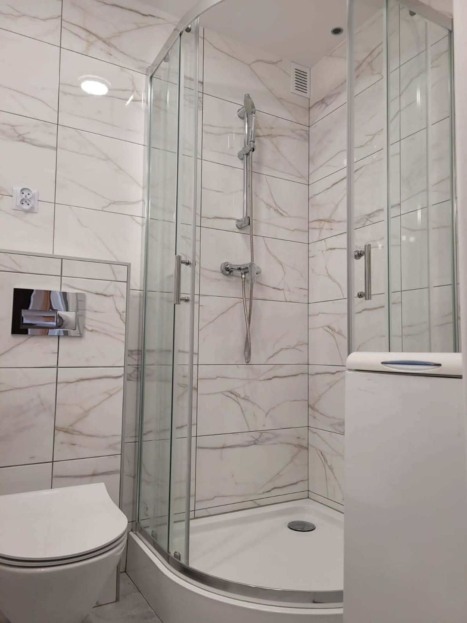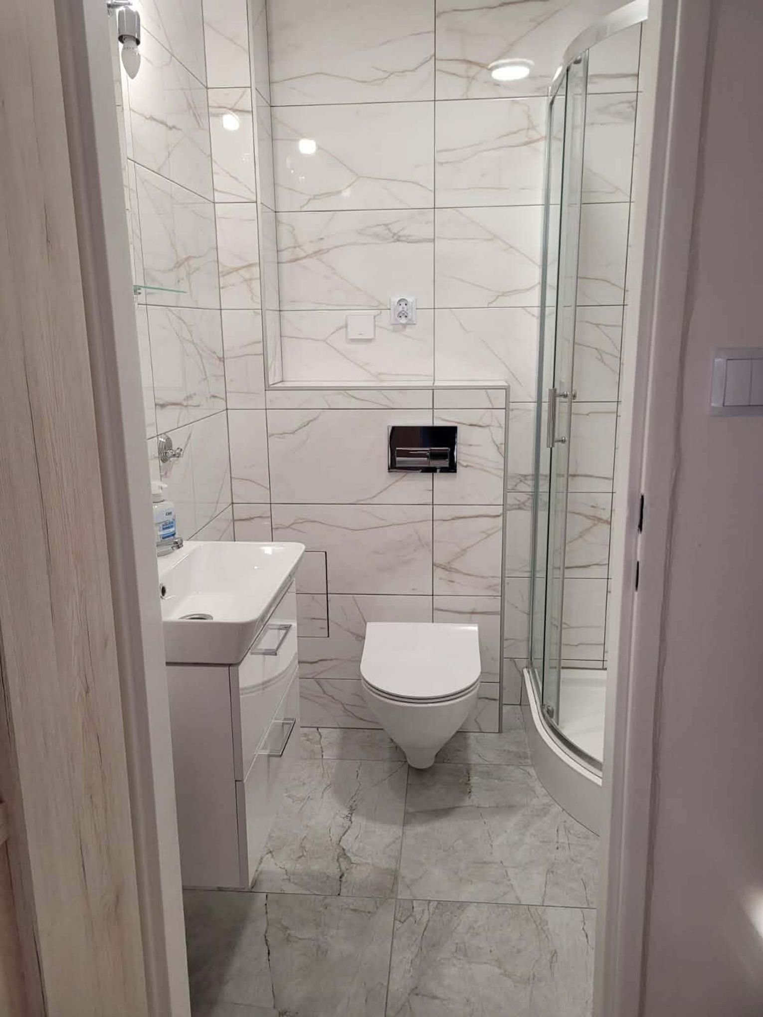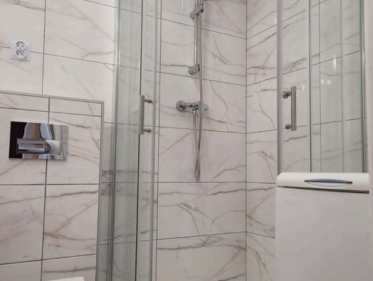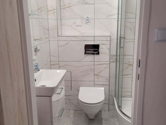 W łazience nowe sprzęty: kabina prysznicowa, pralka, umywalka z szafką, toaleta.
