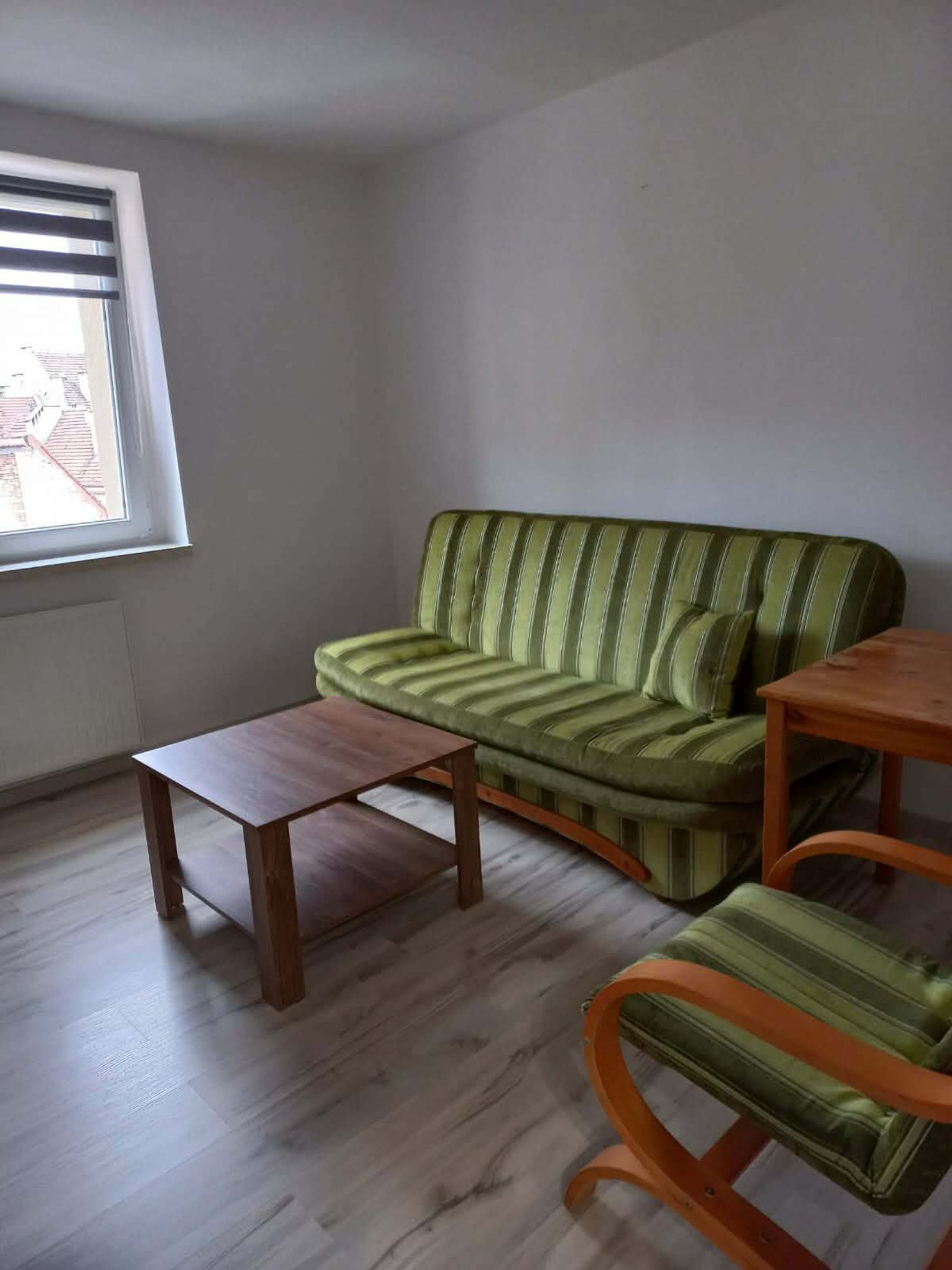 Sypialnia: duże okno, rozkładana kanapa, fotel, 2 stoliki i szafka.