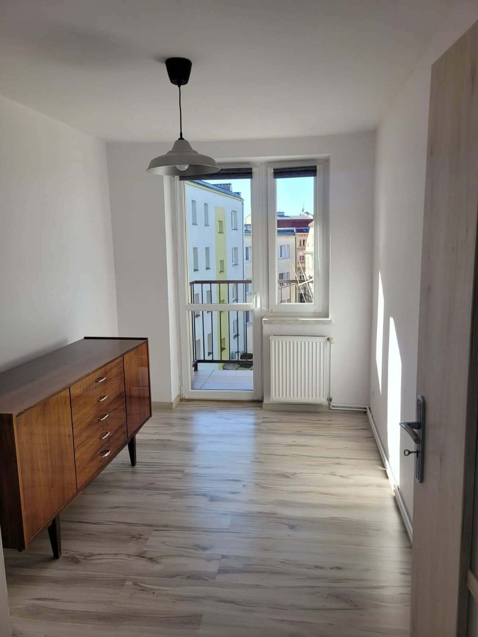Trzeci pokój z ładną komodą i balkonem.